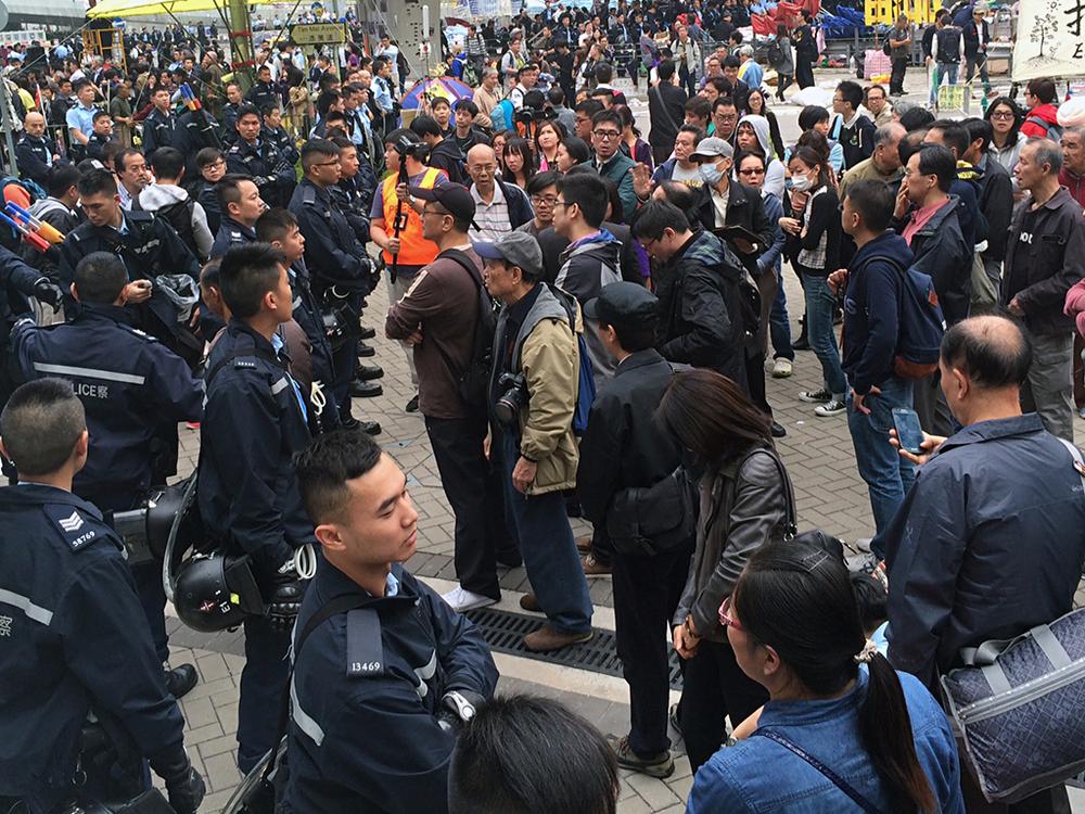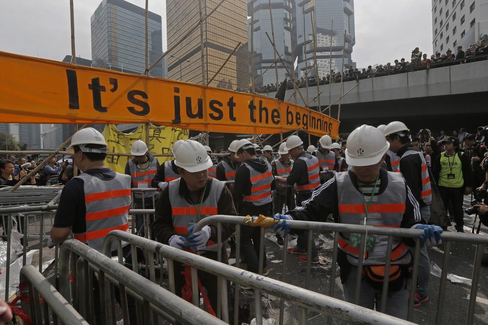 Hong Kong authorities have started clearing barricades from a protest camp across a busy highway as part of a final push to retake streets occupied by activists for two and a half months.