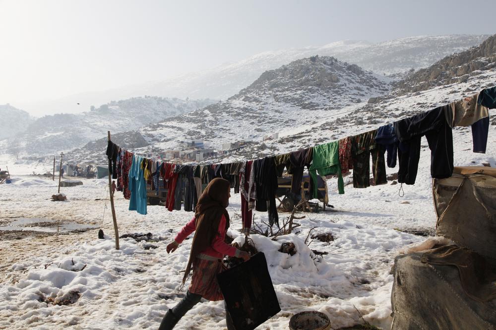 Despite the snowfall and freezing temperatures, refugees hang their clothes on outdoor laundry lines.