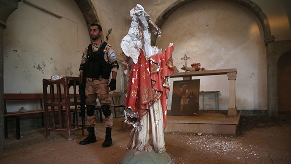 ![A Christian militiaman stands near the broken body of a statue of Christ in the 13th century St. Jacob''s Church near the frontline with ISIL fighters in Telskuf, northern Iraq [Getty]](/wp-content/uploads/2016/04/bb8dbefc21a941939773c392773da577_18.jpeg?resize=770%2C513&quality=80)