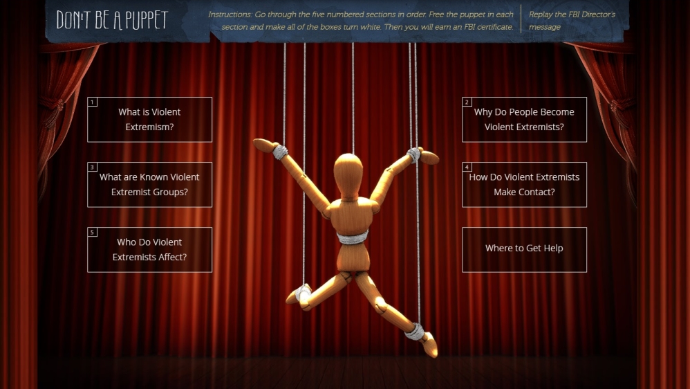 For instance, the FBI website still offers a ludicrous online activity called “Don’t Be a Puppet” – designed for use in schools – in which anyone with nothing else to do can earn a certificate for successfully completing “the FBI’s Countering Violent Extremism training”.
