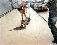 Images showing an Iraqi suspended from a forklift truck and others of two men forced to simulate sex acts were reminiscent of pictures depicting the abuse of Iraqi prisoners by American guards at Abu Ghraib, the notorious prison near Baghdad.
