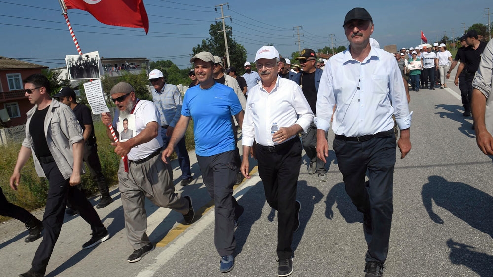 Marching without party insignia and simply a sign with the word “justice” in Turkish, he has been followed by thousands every day and plans to end the march on July 9 with a mass rally outside the prison.