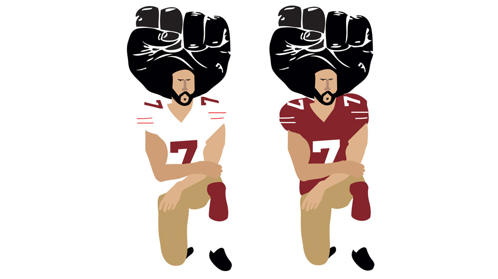 Inspired by Kaepernick’s protest, Khalid Albaih, a Qatar-based Sudanese political cartoonist whose creations have been shown in exhibitions around the world, created an illustration showing the quarterback kneeling with his afro in the shape of a massive black fist.