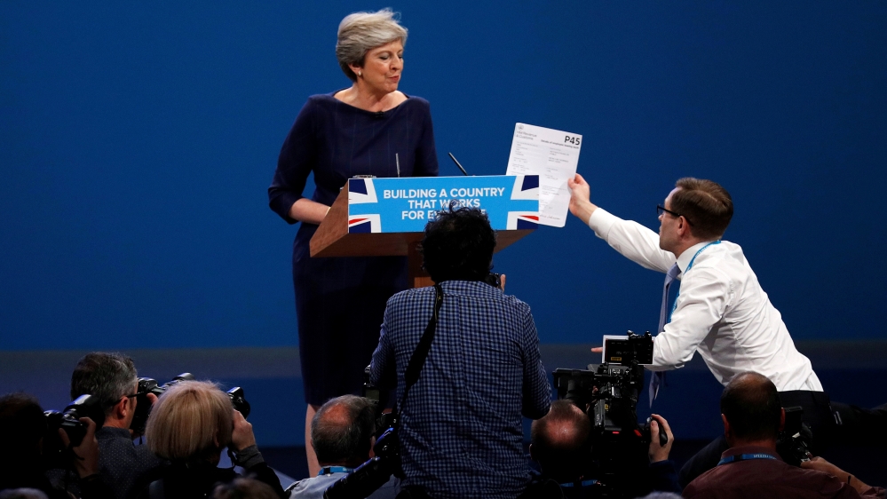 A prankster and comedian has humiliated British Prime Minister Theresa May, offering her a resignation form as she took the podium to deliver a speech at an annual party conference.