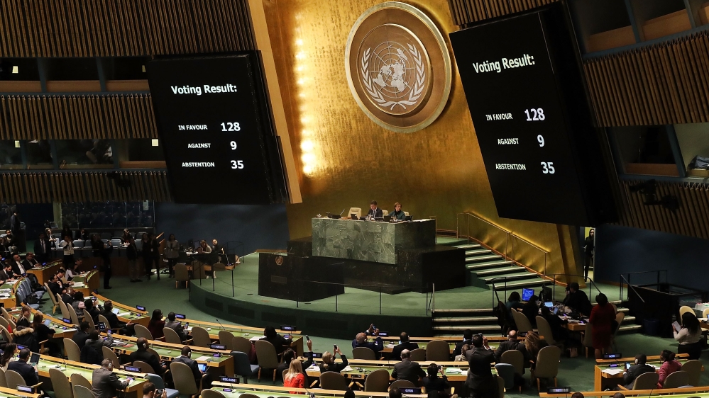 The non-binding resolution was approved at a UN General Assembly emergency meeting on Thursday with 128 votes in favour and nine against, while 35 countries abstained.