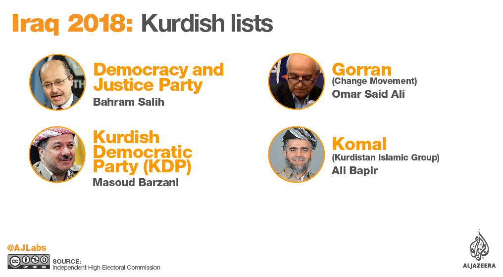 These divisions have spawned a number of smaller parties which will also be running in the elections. They include Goran (Change), and more recently the Democracy and Justice Party led by former senior PUK official Barham Saleh, and the Kurdistan Islamic Group – also known as Komal – led by Ali Bapir.