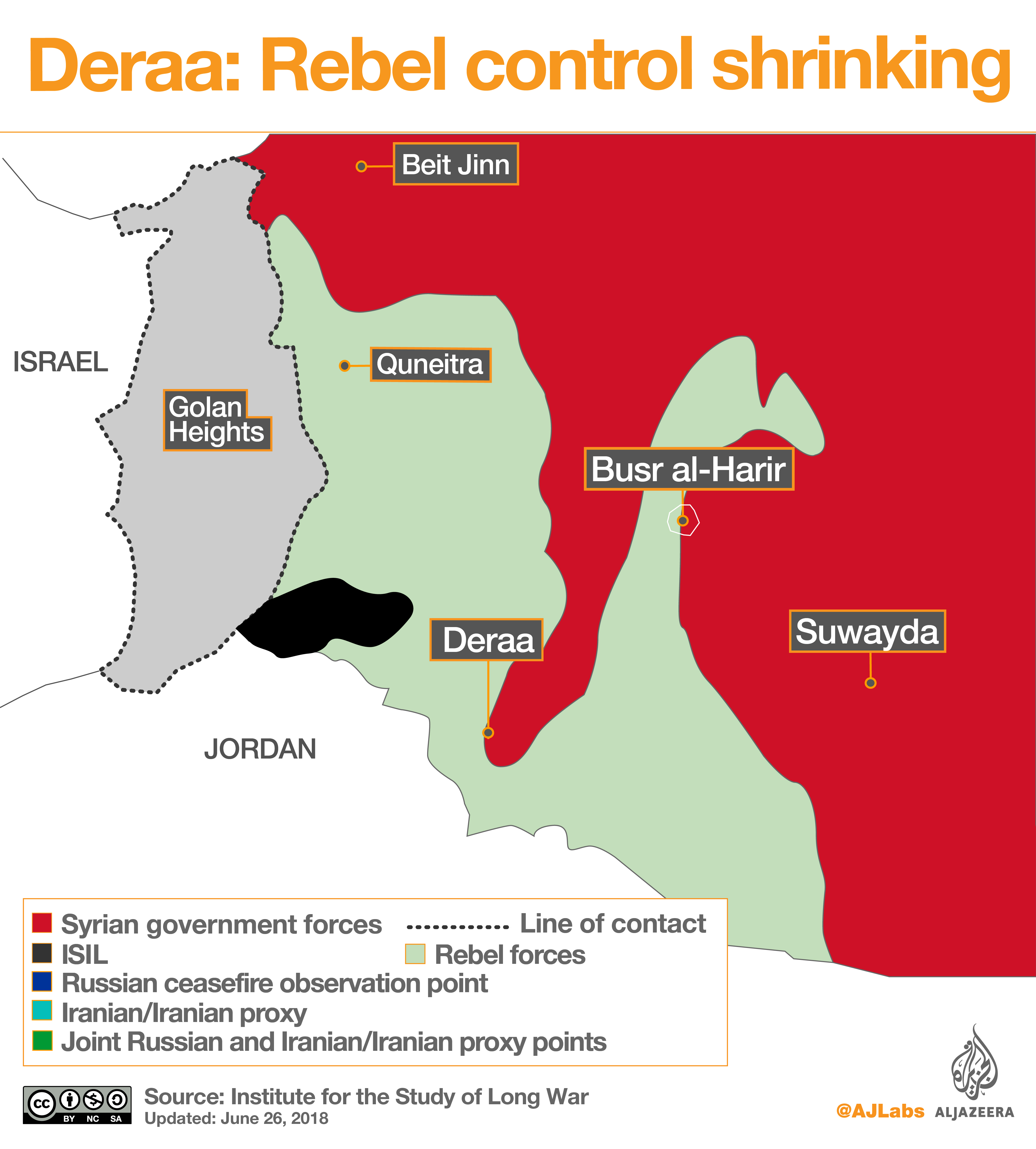 The government’s offensive is in breach of a “de-escalation” agreement negotiated by the US, Russia and Jordan in July 2017. Since then, the deal largely contained fighting in the southwest of Syria.