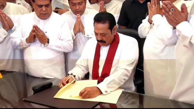 Mahinda Rajapaksa started work on Monday, signing off his first document as the country’s new prime minister.