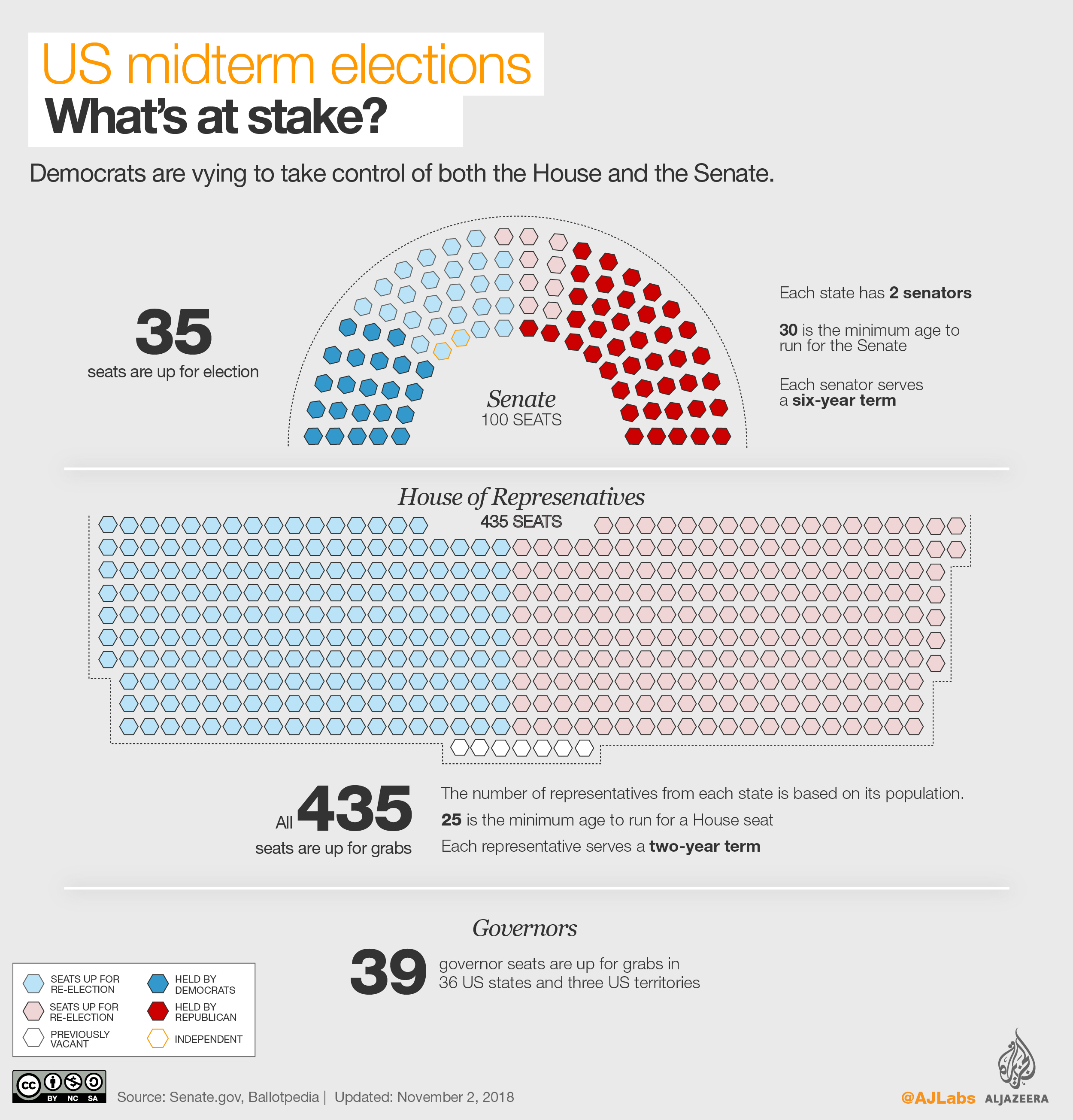 All 435 seats in the House of Representatives were up for grabs on Tuesday, as well as 35 seats in the Senate, and 39 governorships in 36 states and three US territories.