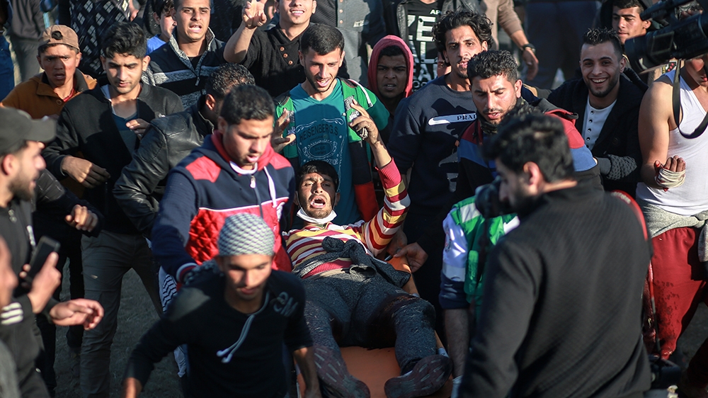 Palestinian protesters carry an injured Palestinian youth during demonstrations along the border with Israel, east of Gaza City on April 1 [Hosam Salem/Al Jazeera]