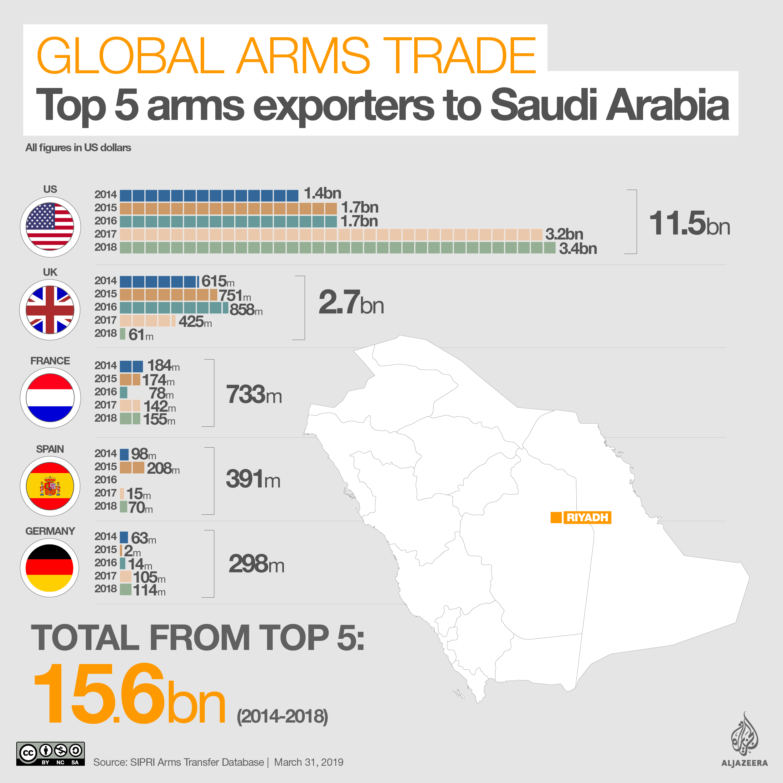 Saudi Arabia is the world’s top arms importer and spent $16.9bn buying weapons in the period between 2014 and 2018, according to the Stockholm International Peace Research Institute (SIPRI), a defence think-tank. At least $4.9bn of that amount was spent on European arms.