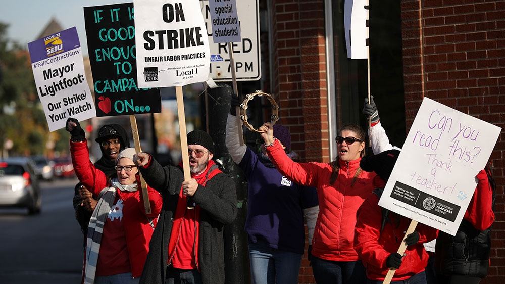 The strike comes seven years after Chicago teachers walked out for seven days over teacher evaluations and hiring practices. In 2016, teachers staged a one-day walkout to protest the lack of a contract and failure to stabilise the school system’s finances.