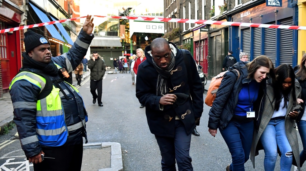 Police presence was heavy in the area, which was sealed off as helicopters circled above. Several buildings were put on lockdown. People in buildings around the scene were evacuated to the north side of the River Thames by security services.
