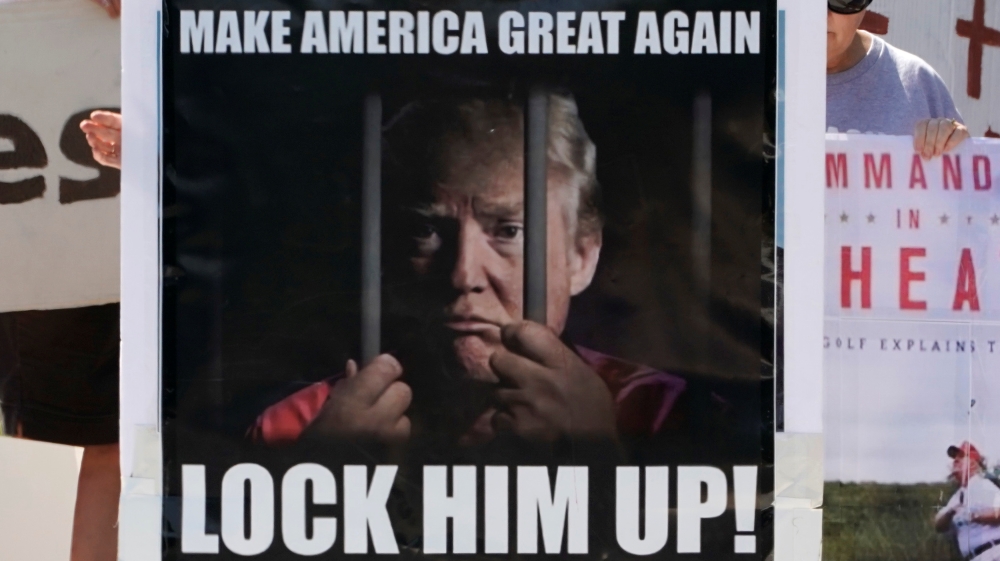 A large number of placards held by protesters also bore a simple message: that any Democrat “will do”, instead of Trump.