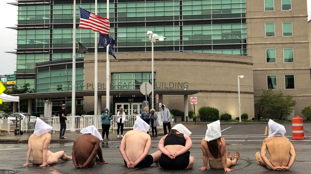 Naked except for “spit hoods” in a reference to the killing of Daniel Prude, several protesters sat outside Rochester’s police headquarters Monday morning to push for police accountability, local news outlets reported.