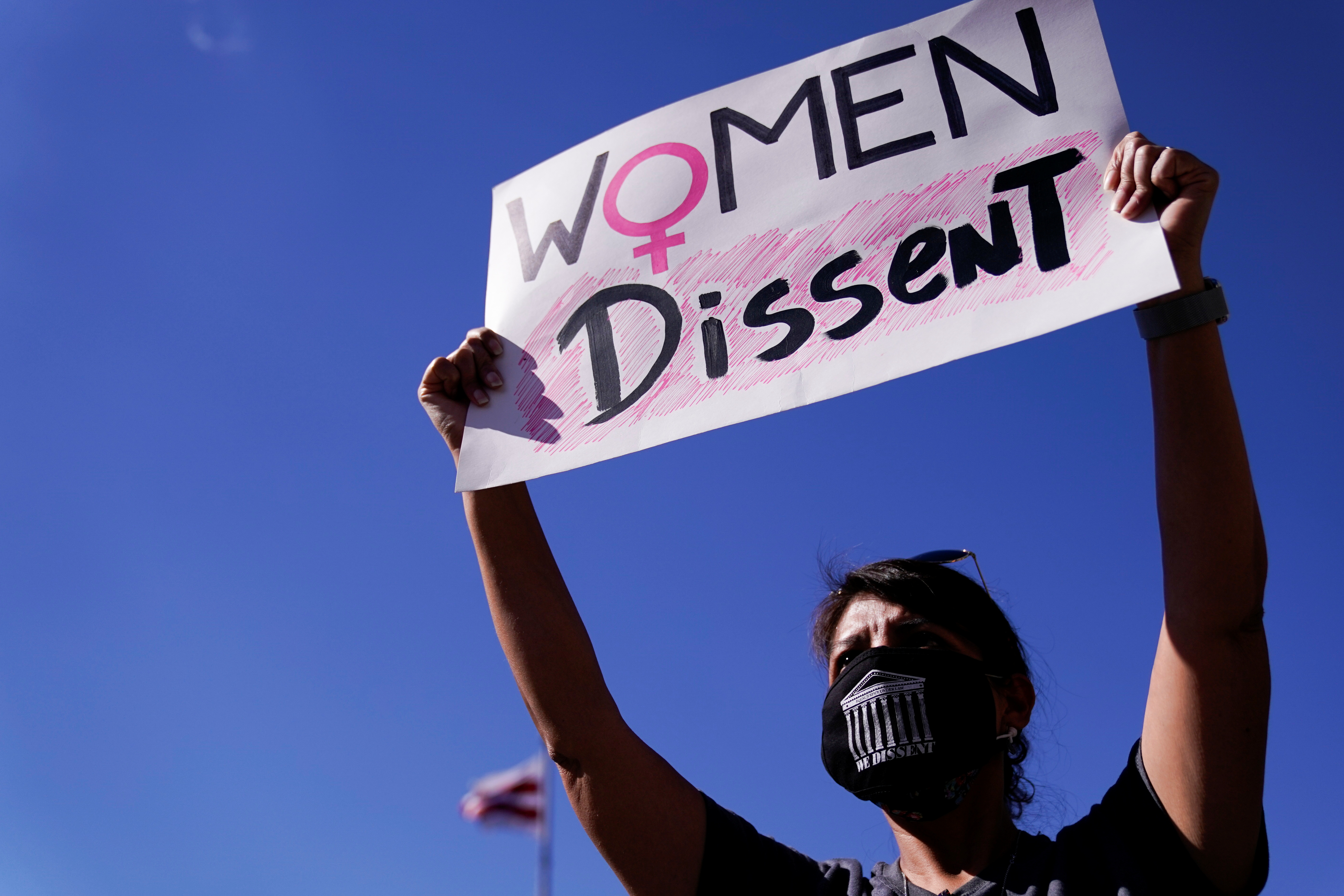 “We Dissent,” said a cardboard sign carried by a young woman wearing a red mask with small portraits of Bader Ginsburg.