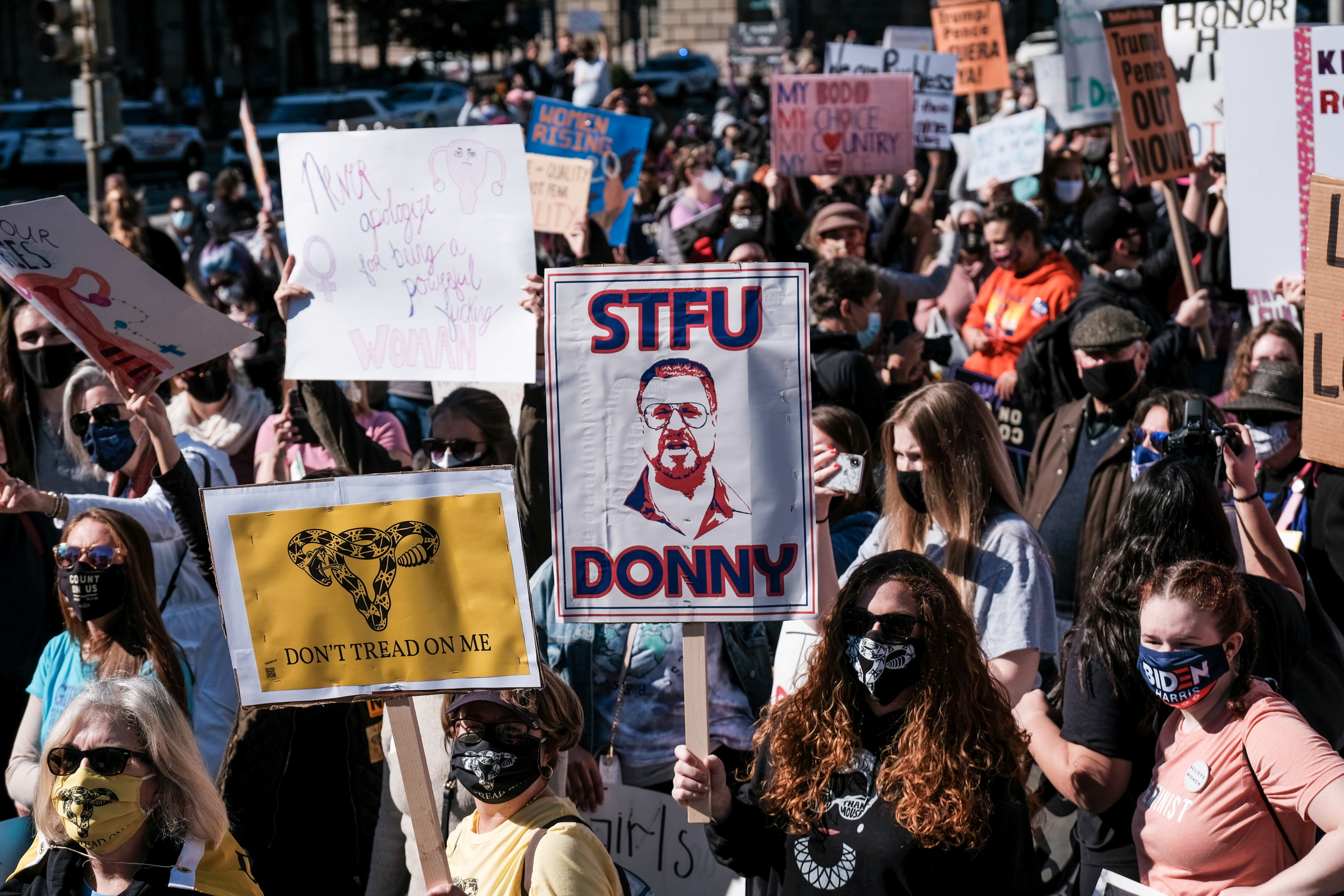 “The fact of the matter is that we are powerful and they are afraid,” said Sonja Spoo, the director of the reproductive rights campaigns at UltraViolet, a feminist advocacy group, one of the speakers at the protest. “They are on the ropes and they know it and we are about to give the knock-out punch.”