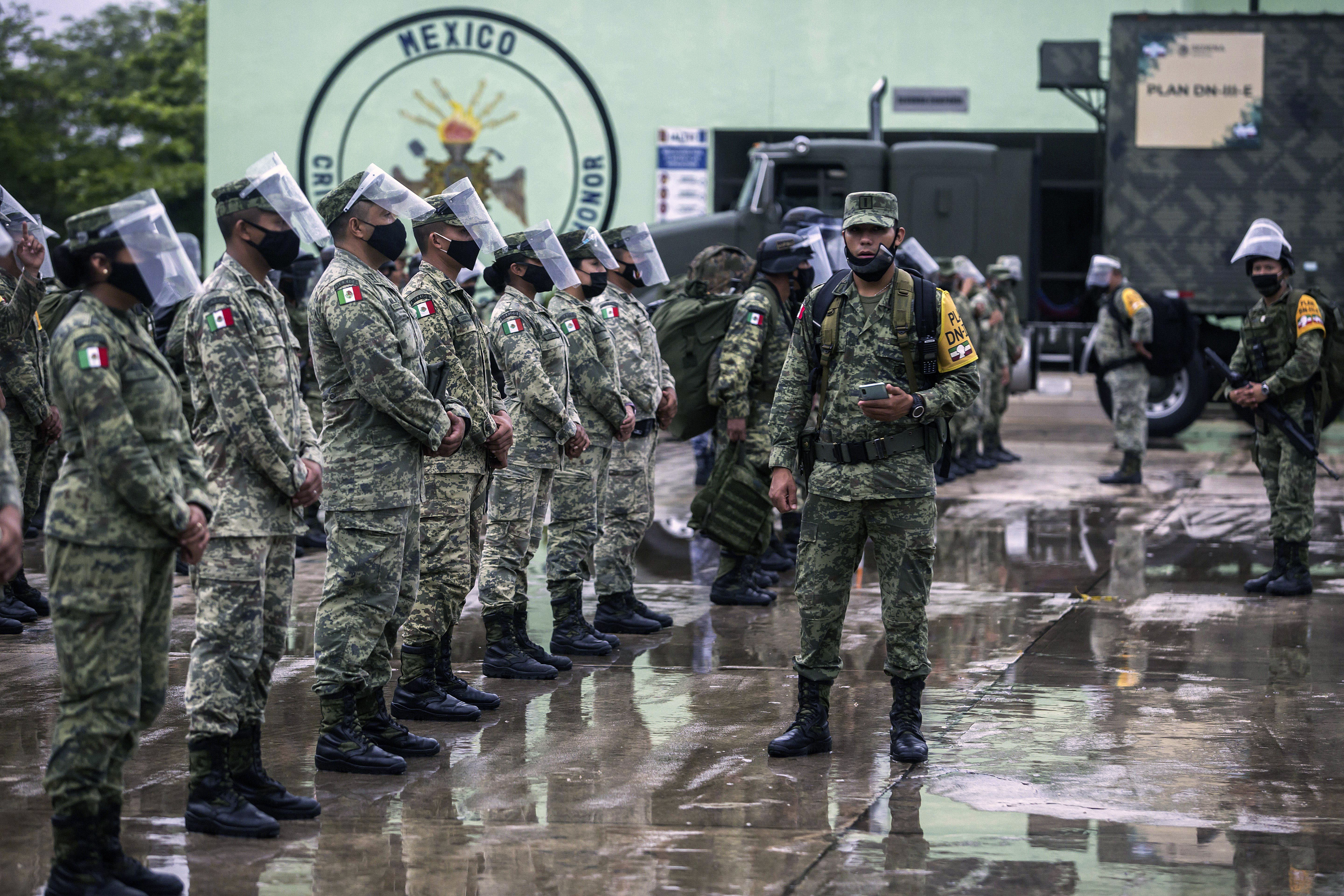 Soldiers wearing masks and face shields were seen preparing to deploy for relief efforts.