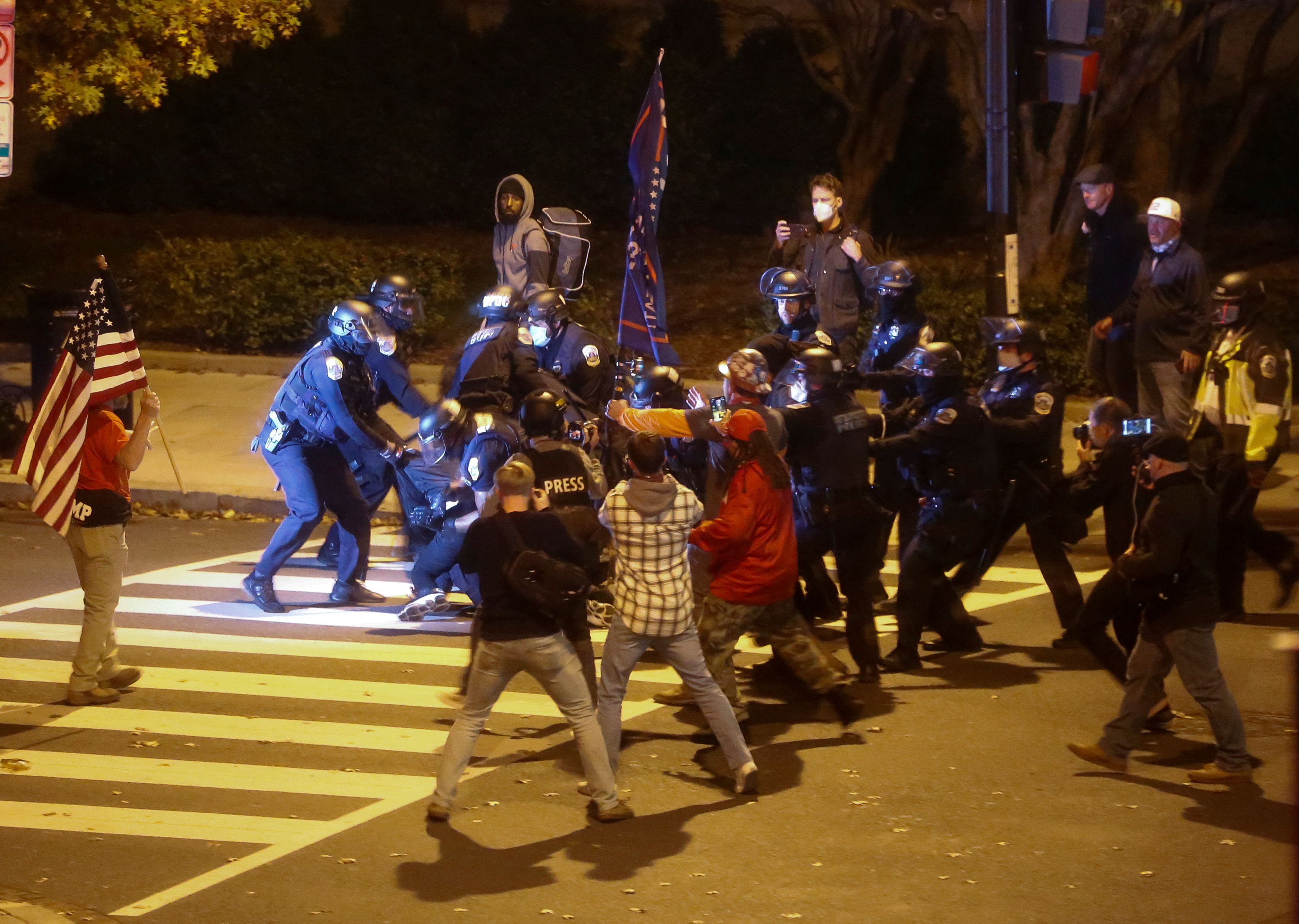 In a pattern that kept repeating itself, those Trump supporters who approached the area were harassed, doused with water, and saw their Make America Great Again hats and pro-Trump flags snatched and burned, amid cheers. As night fell, multiple police lines kept the two sides apart.