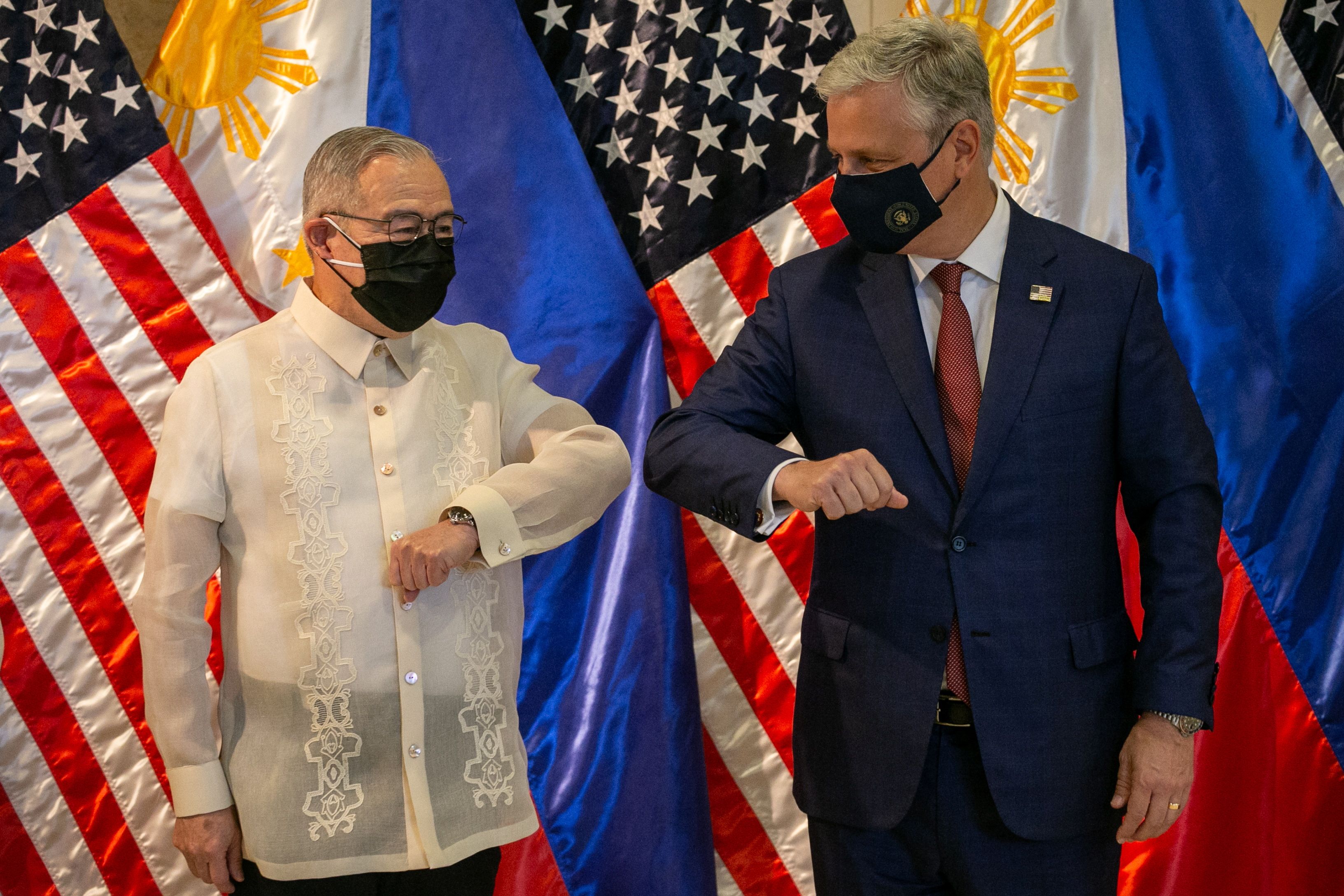 China condemned comments by O’Brien, seen in Manila with Philippines Secretary of Foreign Affairs Teodoro Locsin Jr, left, offering US support over the South China Sea [Eloisa Lopez/Reuters]