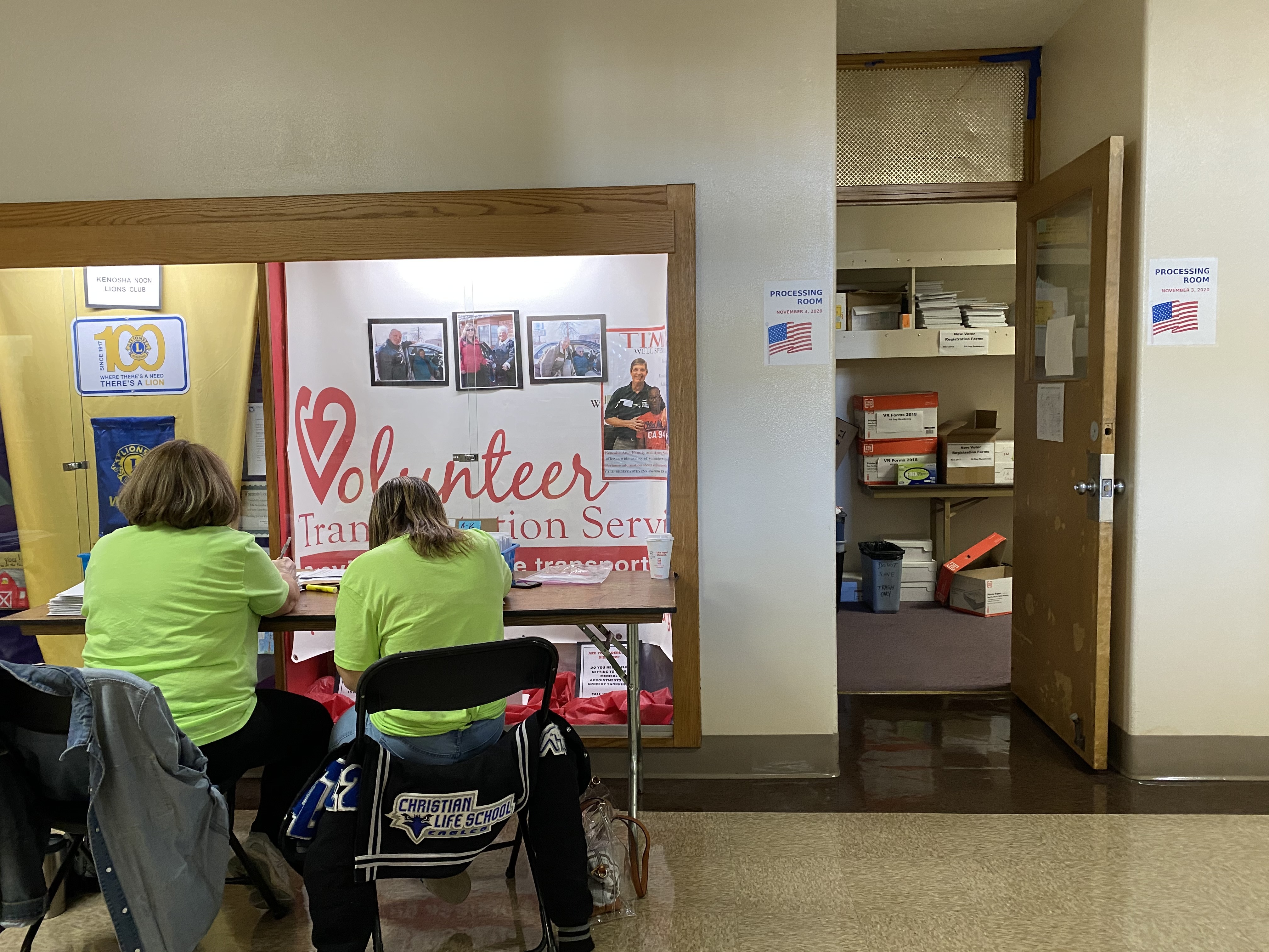 Inside Kenosha’s municipal building, hallways dedicated to central count efforts – to tally absentee ballots separately from the polls – are bustling with volunteers and city officials. Dressed in neon green shirts, dozens of poll workers are steadily counting the 57,650 ballots that have been returned so far at tables of two, spaced six feet apart.