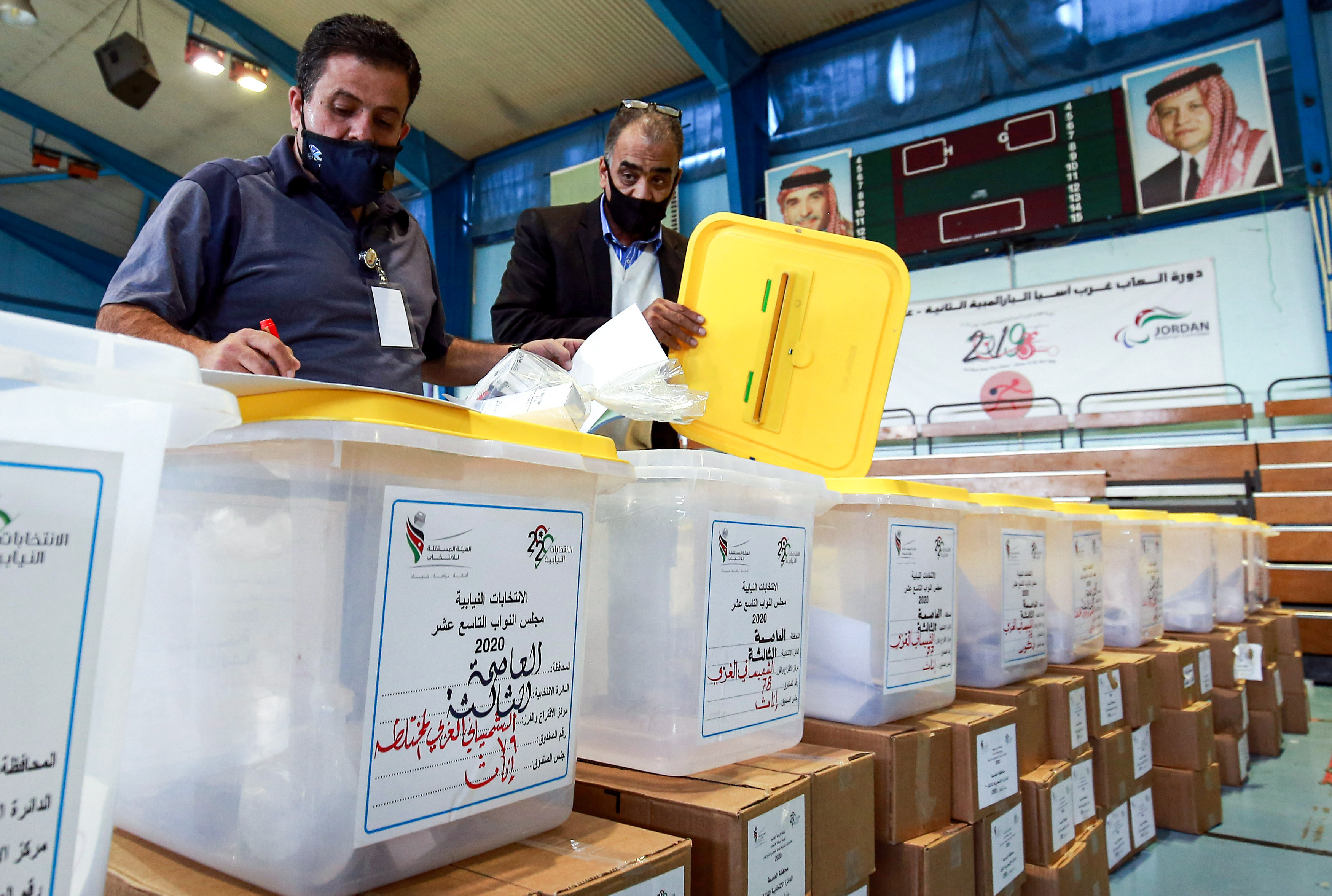 Employees of Jordan's Independent Election Commission prepare ballot boxes at a polling centre in Jordan's capital, Amman [Khalil Mazraawi/AFP]