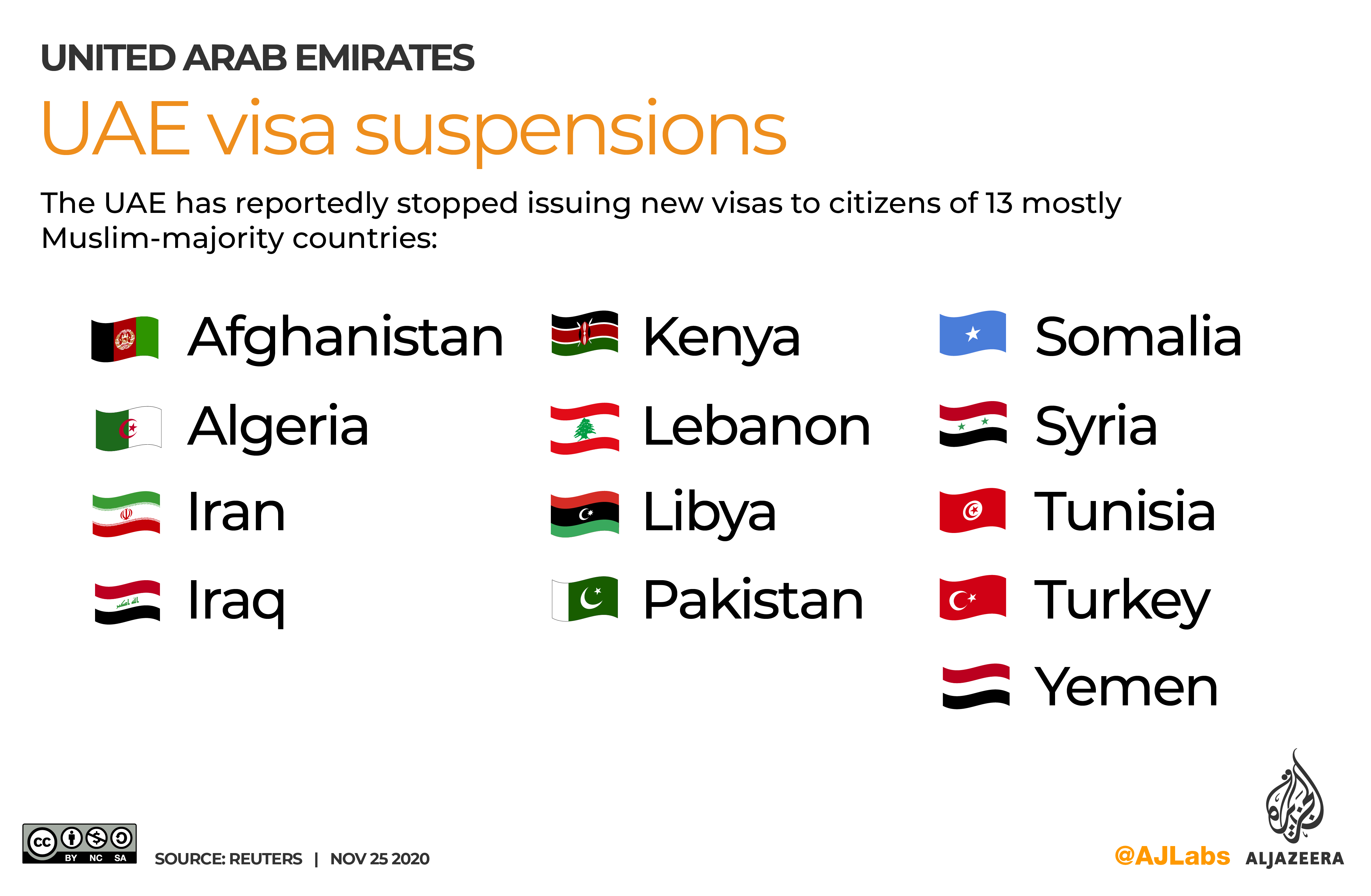 The countries were Afghanistan, Algeria, Iran, Iraq, Kenya, Lebanon, Libya, Pakistan, Somalia, Syria, Tunisia, Turkey and Yemen. Citizens of those countries who were already in the UAE did not appear to be affected by the new restrictions.