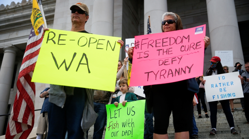 More than 46,000 people in the US have died from COVID-19, while 22 million have applied for unemployment benefits since March. It’s that economic cost that has led some state governors to follow Trump’s lead and start talking about allowing some shuttered businesses to reopen, including those in Georgia, where many businesses – including gyms, bowling alleys and tattoo parlours – can do so starting Friday. Restaurants there can resume dine-in service next week.