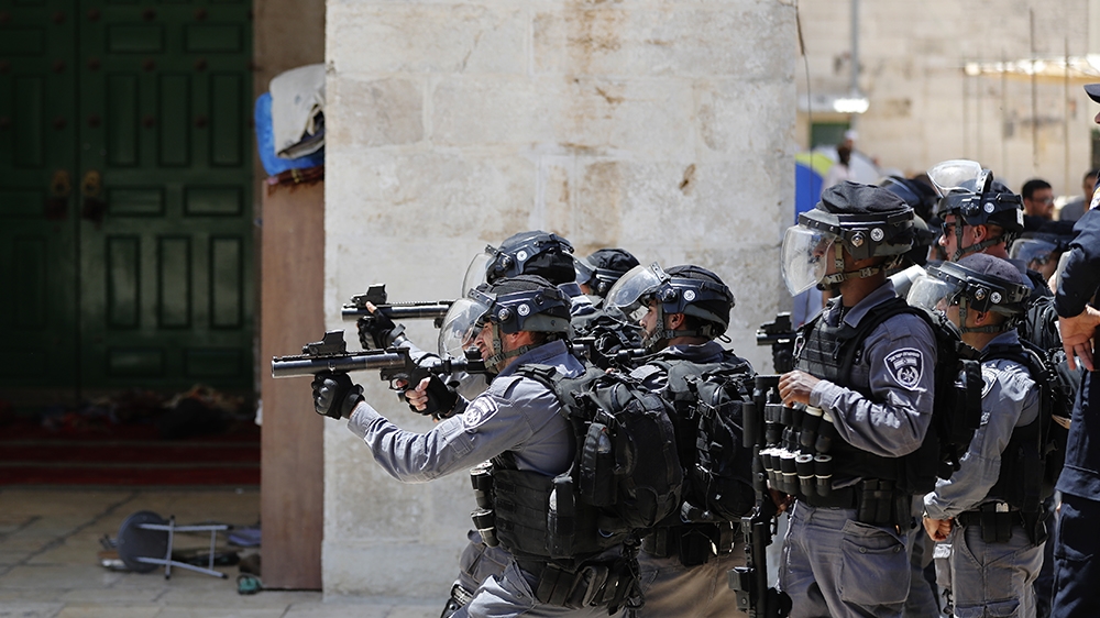 Israeli security forces aim tear gas at Palestinian protesters at the Al-Aqsa Mosque compound, in the Old City of Jerusalem on June 2, 2019, as clashes broke out while Israelis marked Jerusalem Day.