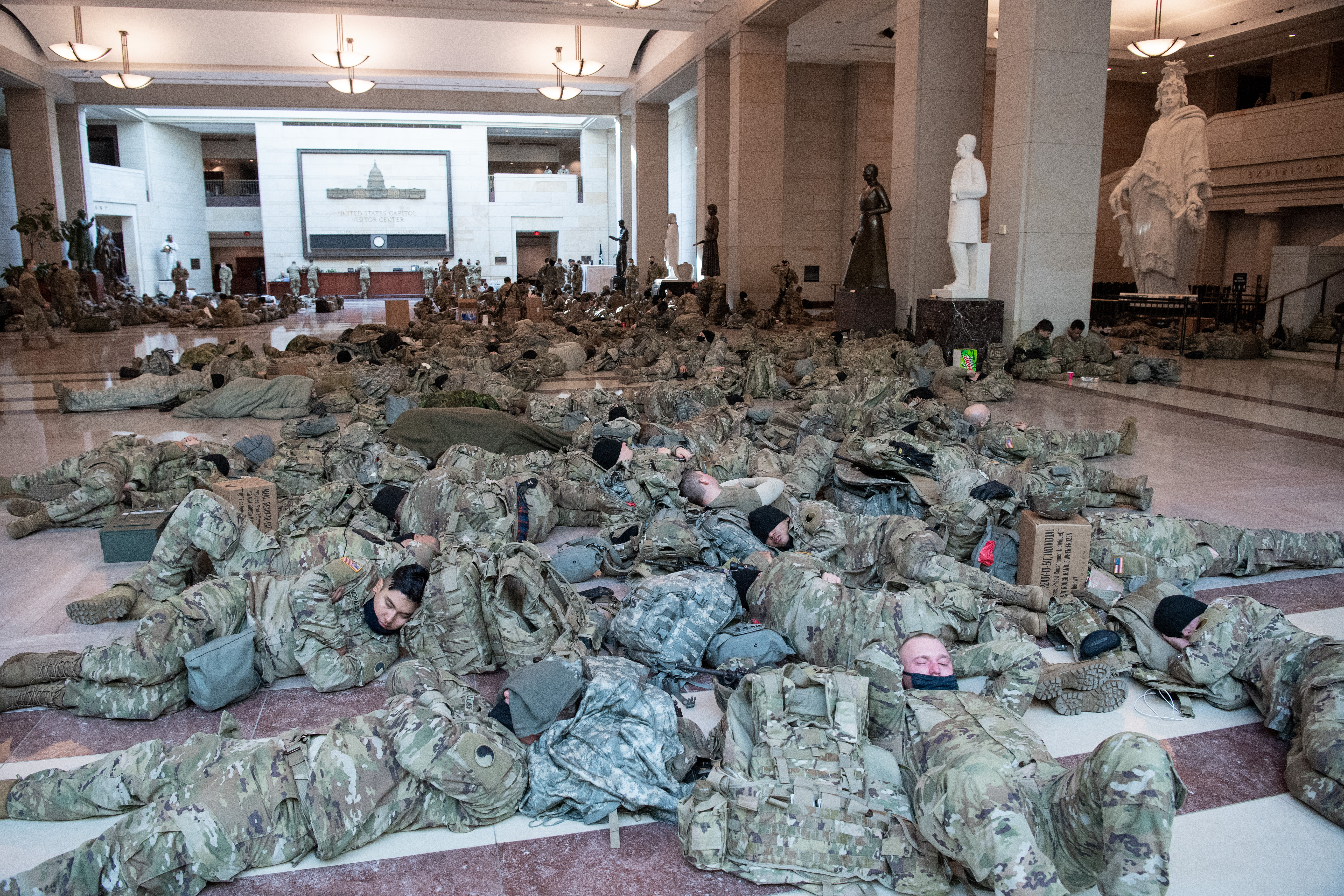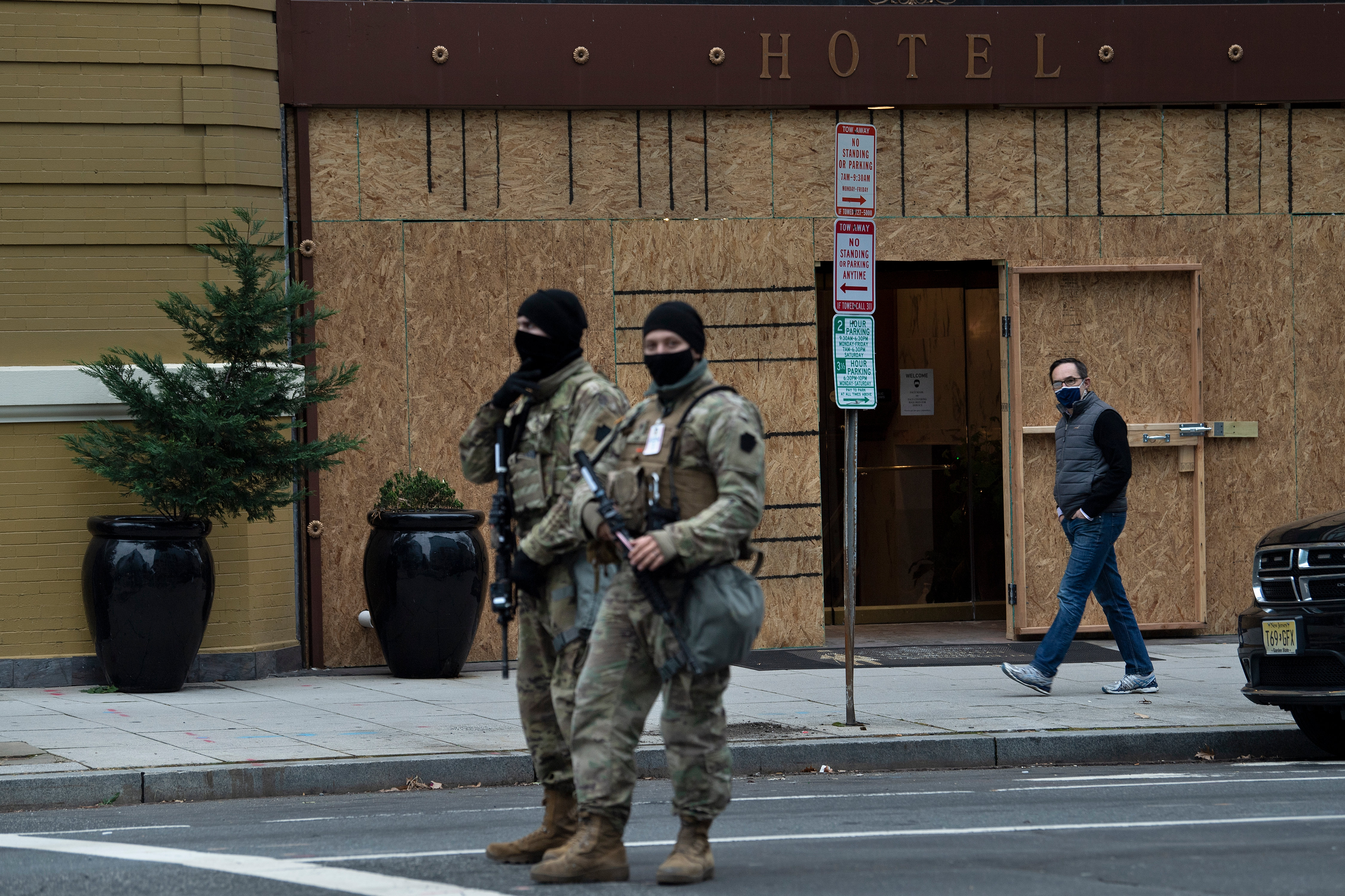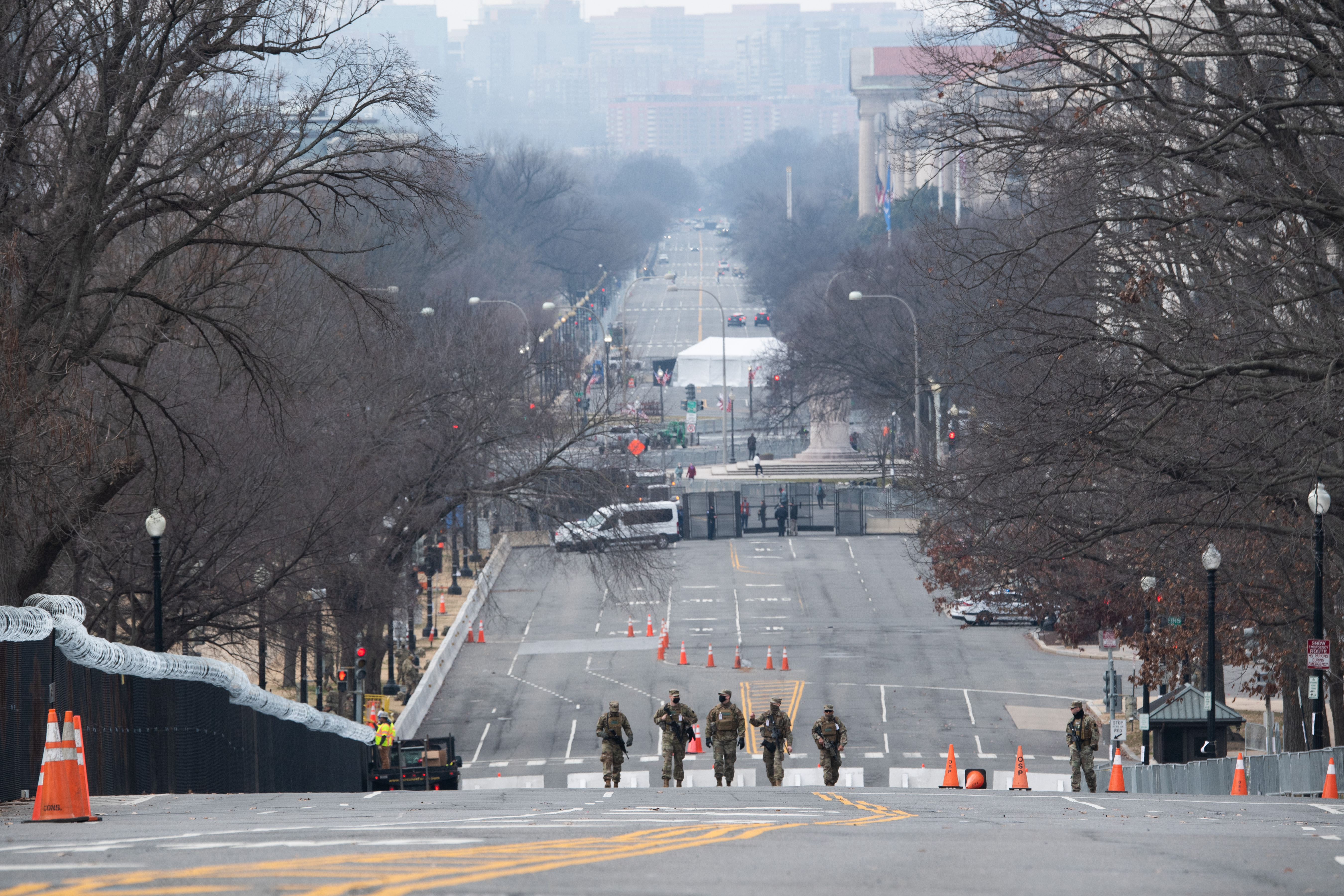 The US capital city is already highly fortified several days out from the main event. Throngs of National Guardsmen have been sleeping on the floor of the Capitol building as their compatriots guard fenced roadblocks around the premises alongside large beige military trucks.