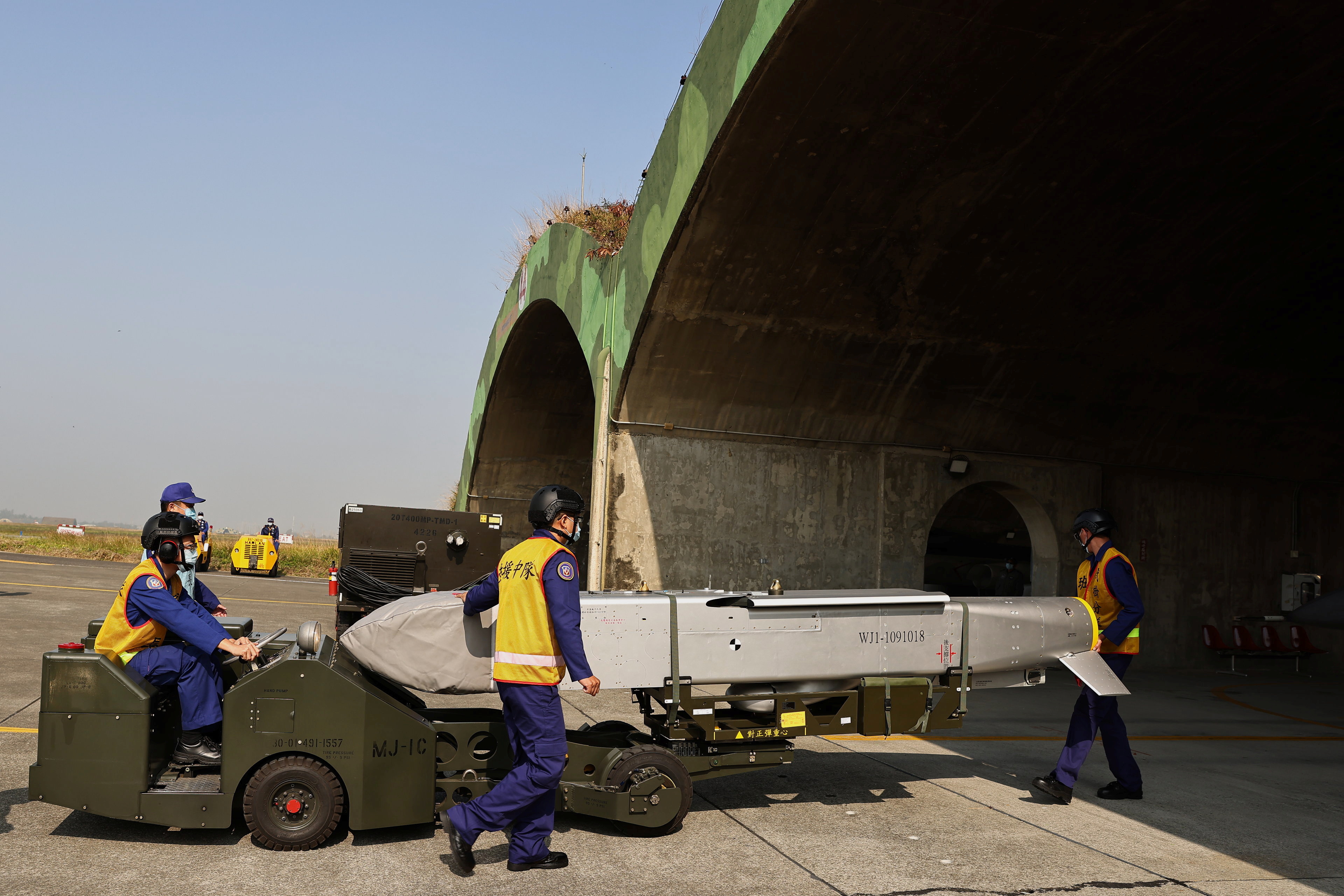 In a hardened shelter, flight crew from the First Tactical Fighter Wing rushed to ready two IDFs as an alarm bell rang out, aiming to get them off the ground within five minutes of an emergency call, armed with US-made Sidewinders and domestically-developed Wan Chien air-to-ground cruise missiles.