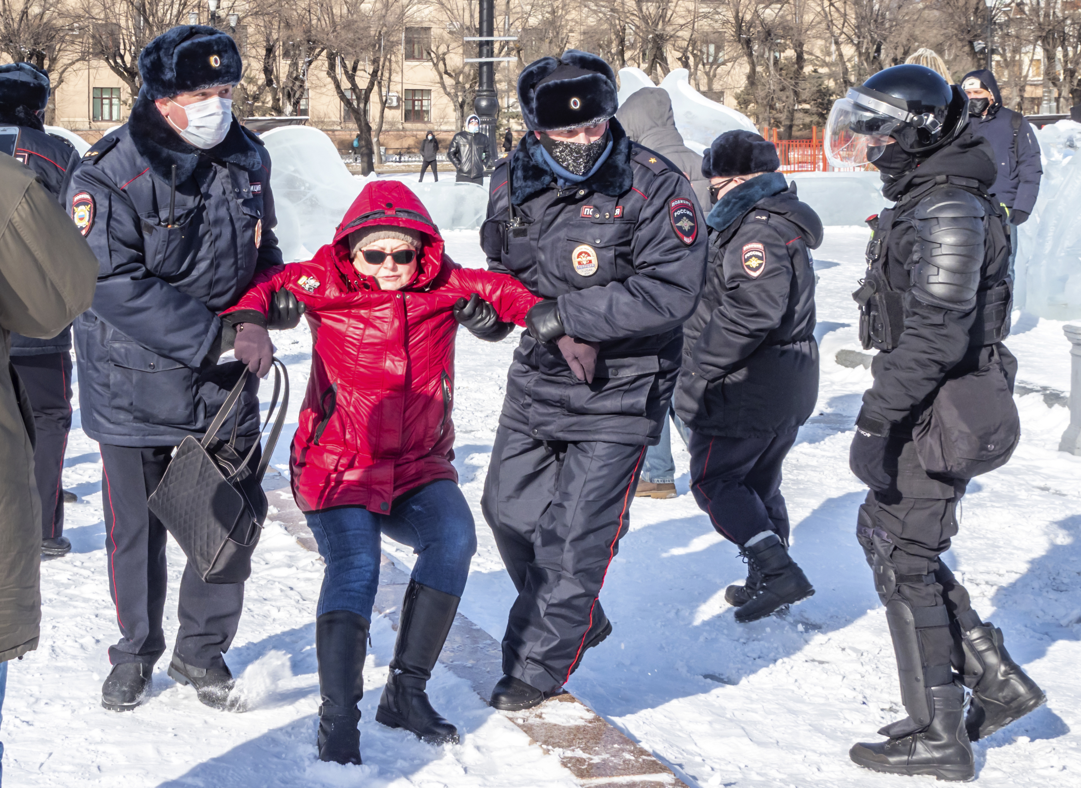 Footage from Vladivostok showed dozens of protesters escaping the police on the frozen waters of the Amur Bay and circle dancing. More than 100 arrests were made there.