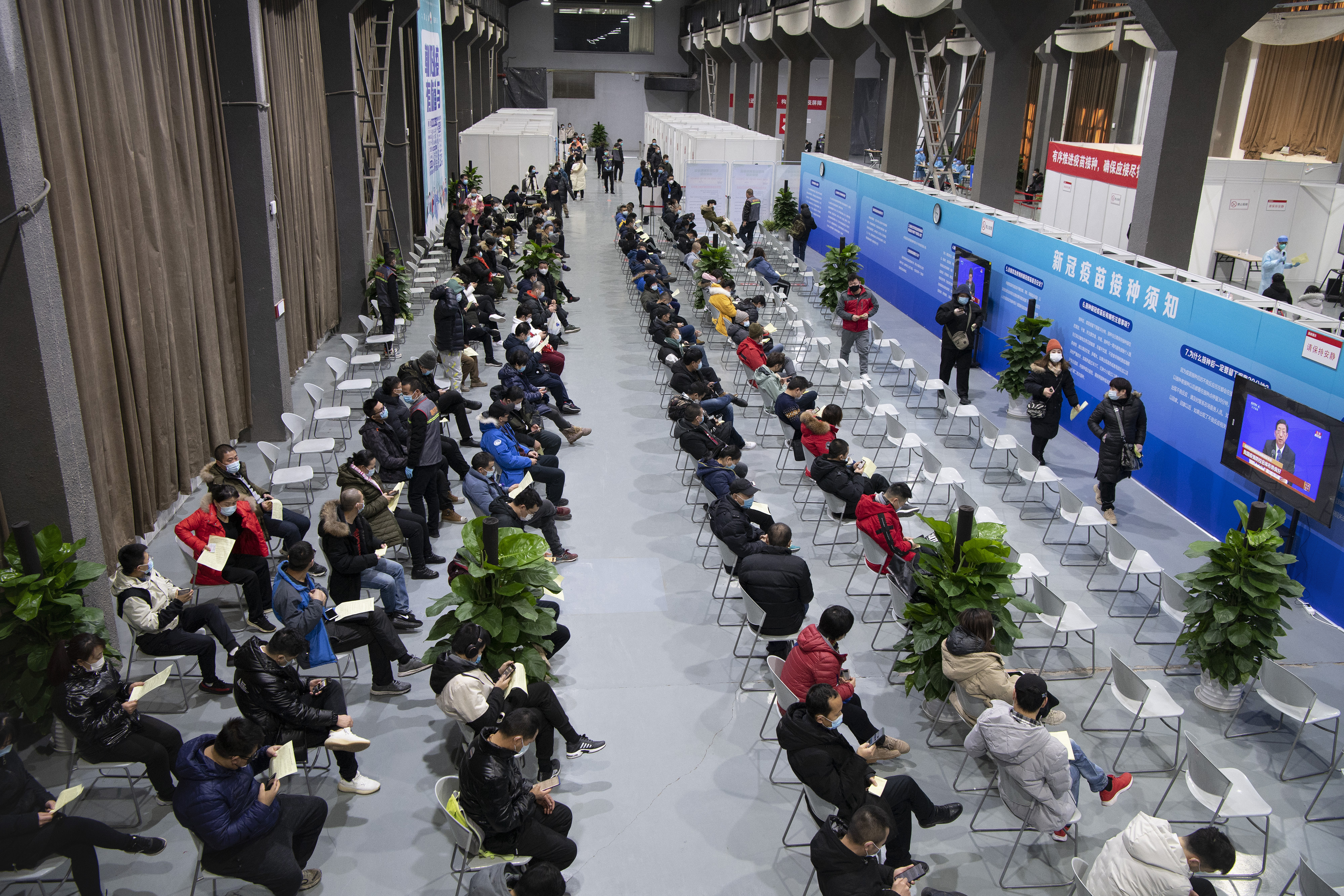 Footage from state broadcaster CCTV showed queues outside local hospitals and community health centres as people waited to read consent forms and have their temperatures taken before getting the jab.