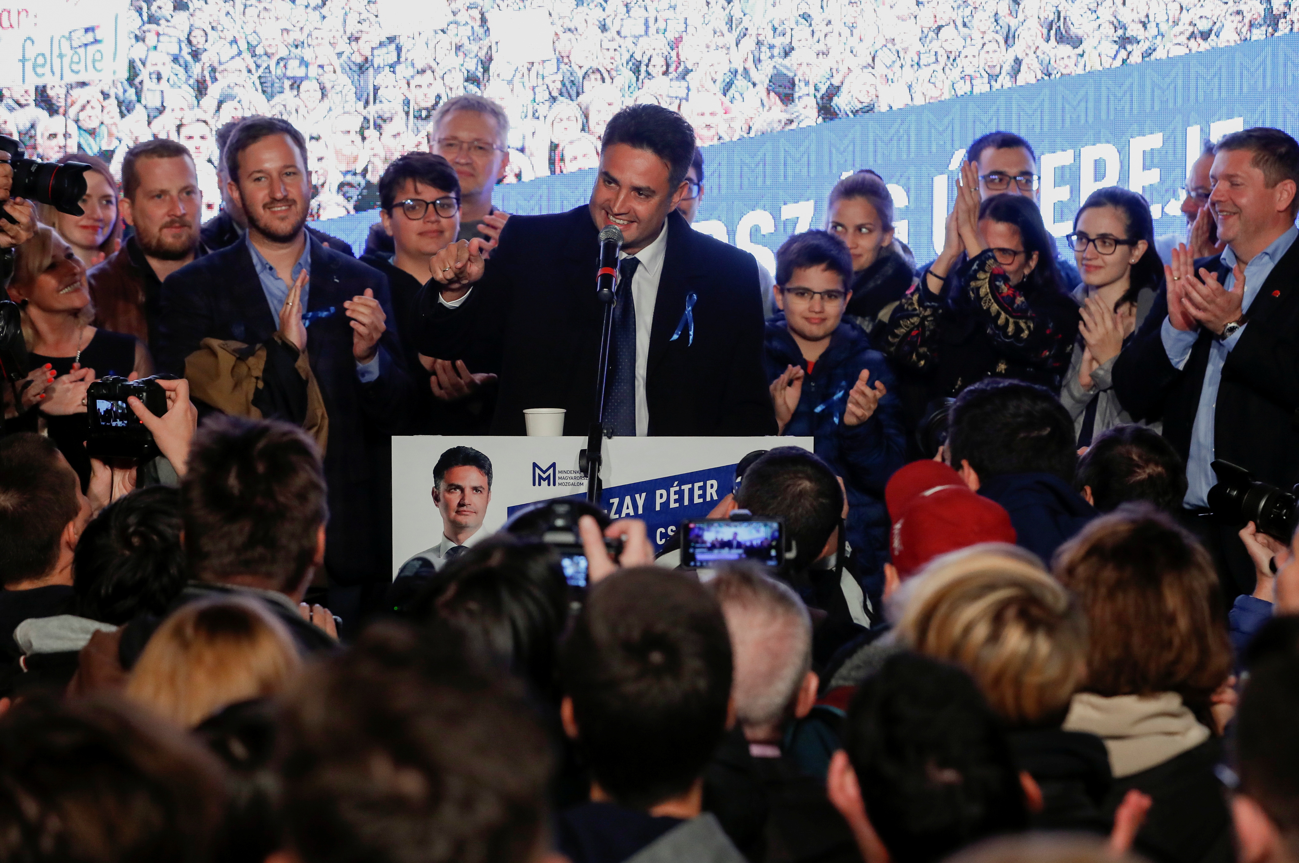 “We can only win together,” Marki-Zay told cheering supporters with his wife and seven children standing behind him.