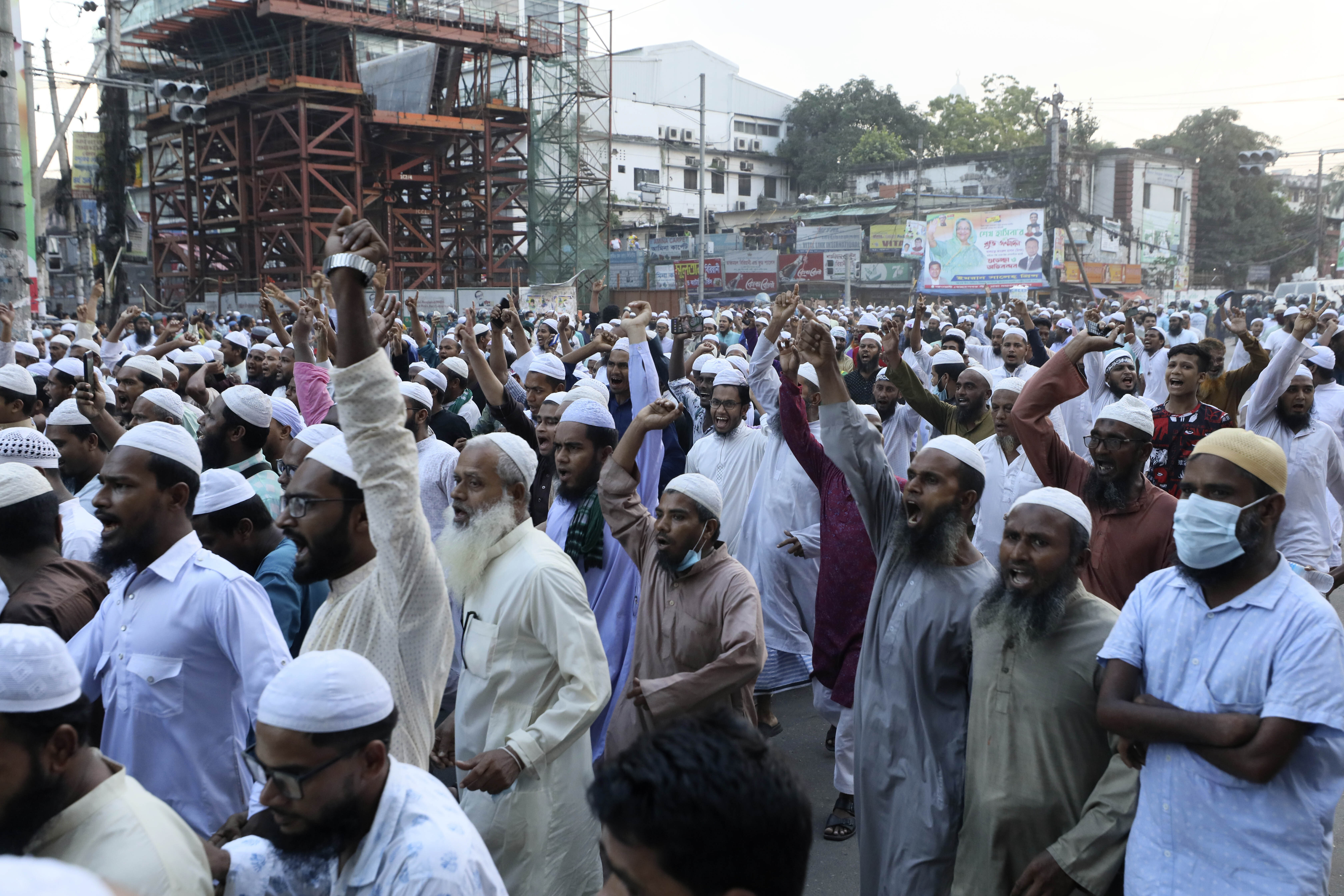 The incident came a day after some 10,000 protesters – many of them carrying banners of Islamist political parties – took to the streets outside Dhaka’s main mosque.