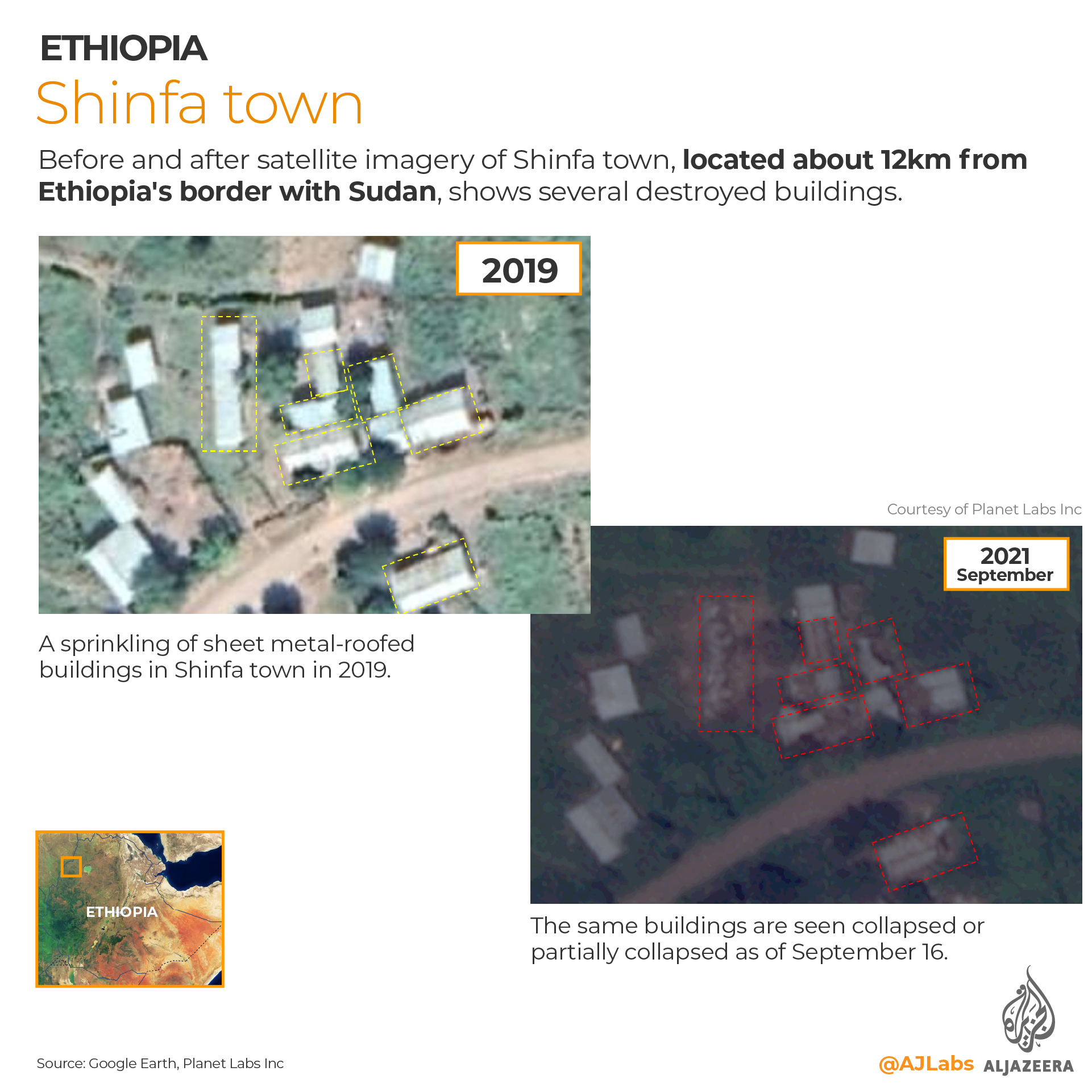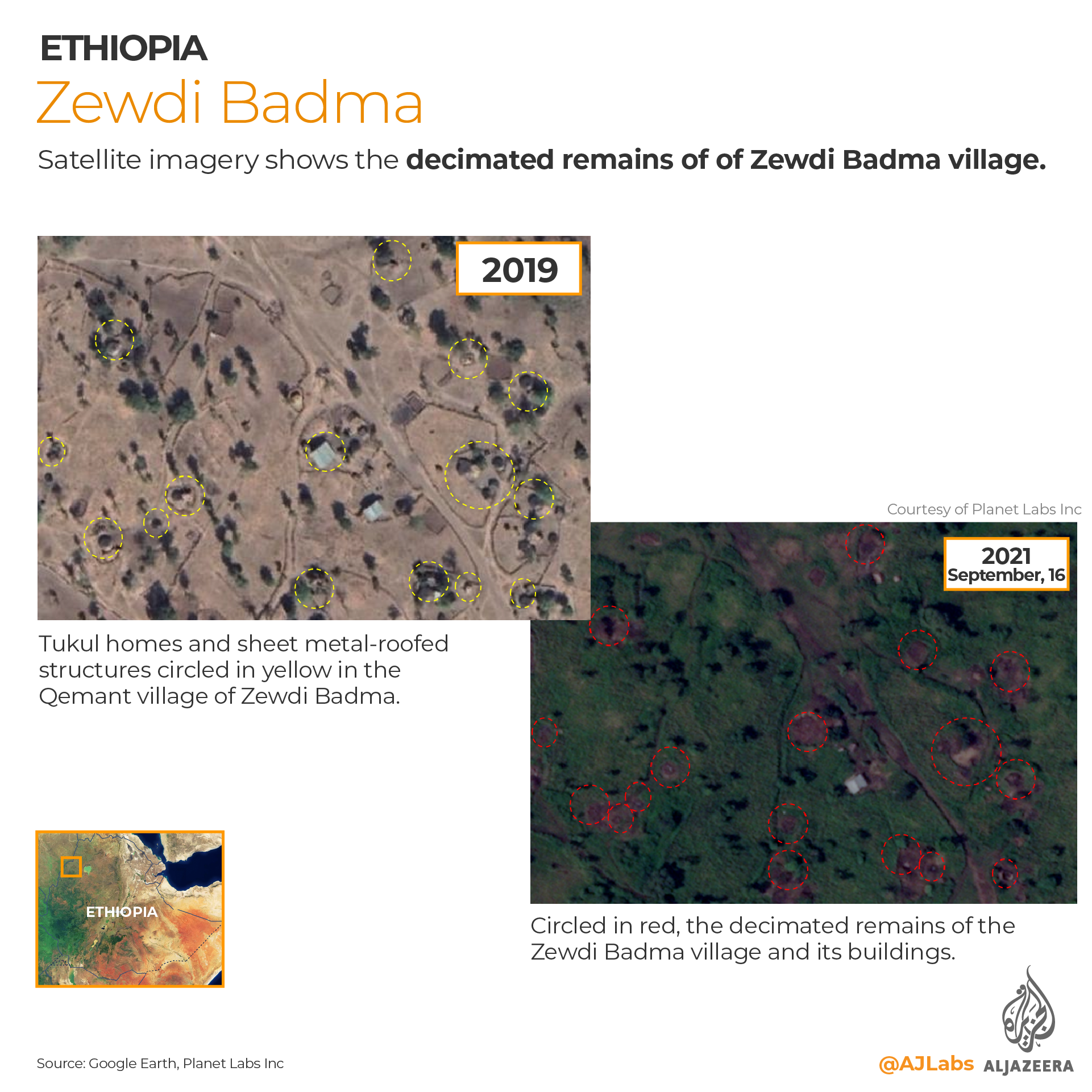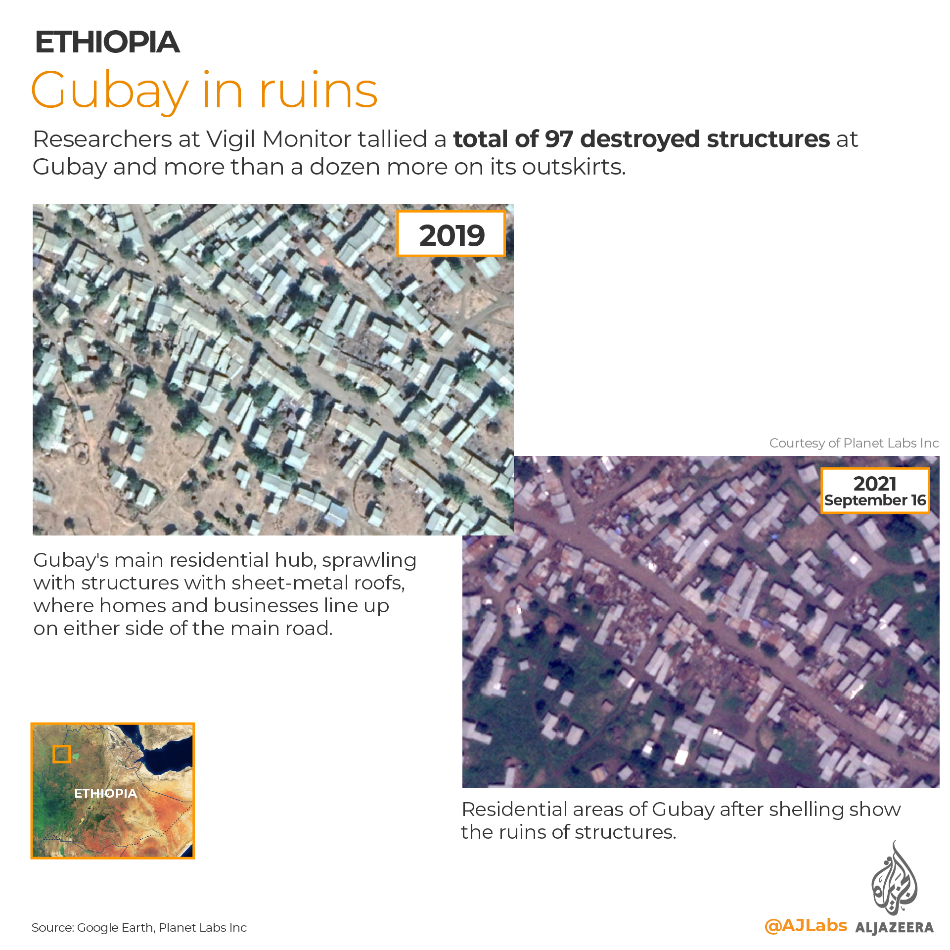 UK-based non-profit research organisation Vigil Monitor, which has been documenting atrocities across Ethiopia since the breakout of war in November of last year, worked in tandem with Al Jazeera and studied satellite imagery provided by Planet Labs, a private satellite operator, of areas identified by at least a dozen displaced people as having been heavily affected by military operations. The imagery revealed widespread destruction of some 557 civilian structures spanning from May 2021 until the present, largely corroborating witness accounts.