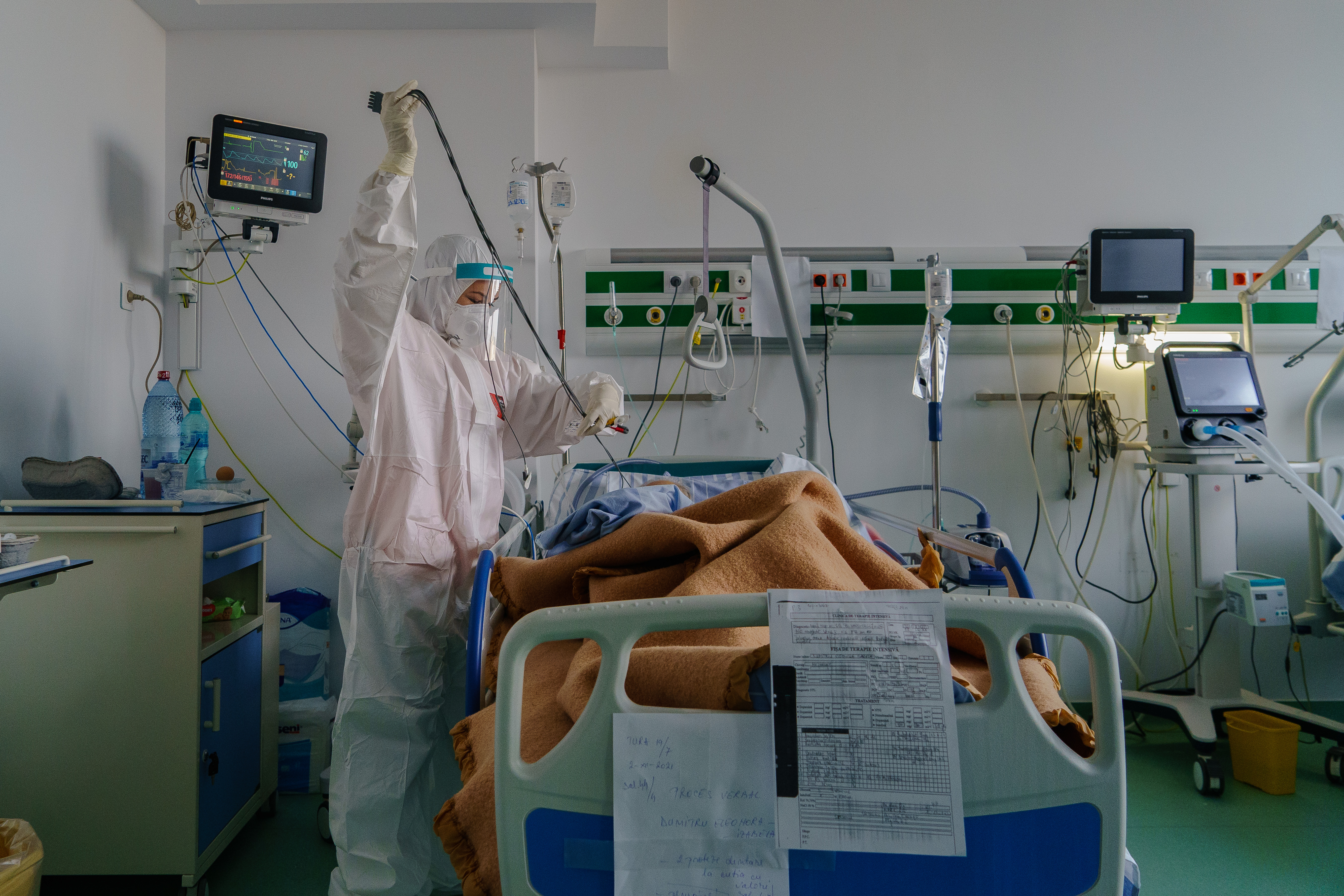 Bucharest, Romania – At a temporary COVID-19 intensive care unit at the University Emergency Hospital in Bucharest, set up to cope with the strain of Romania’s devastating fourth wave, a cardiac monitor beeps with a warning.