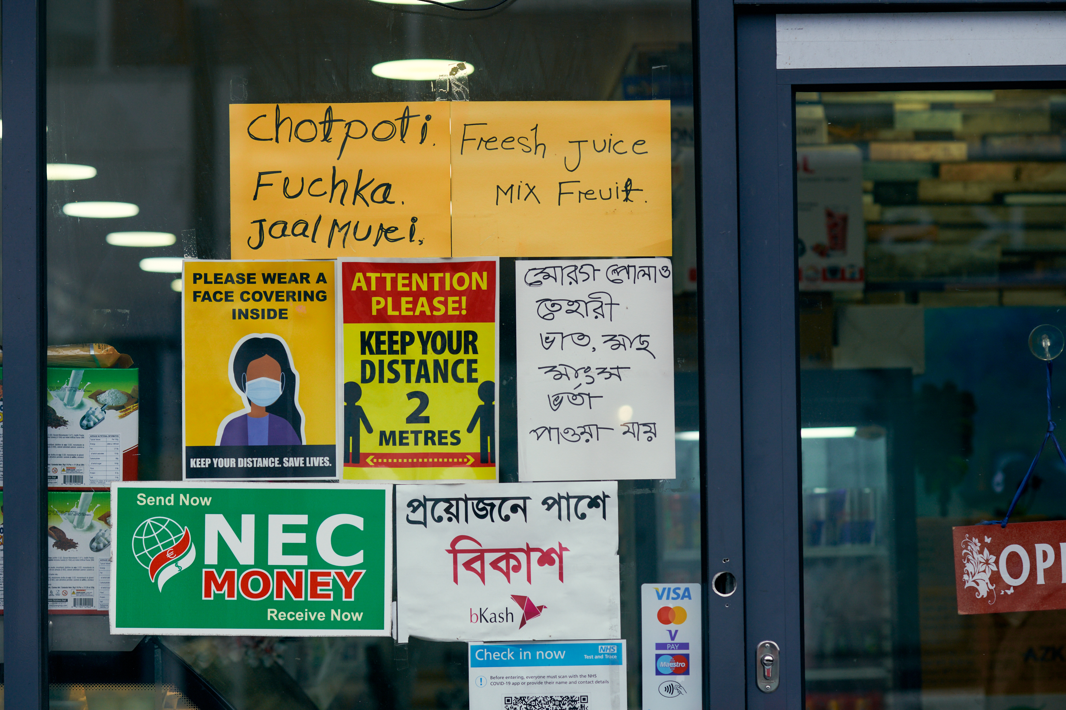 As the winter cold sweeps through Green Street, shop windows are adorned with signs in various languages urging people: “Please wear a mask covering.”