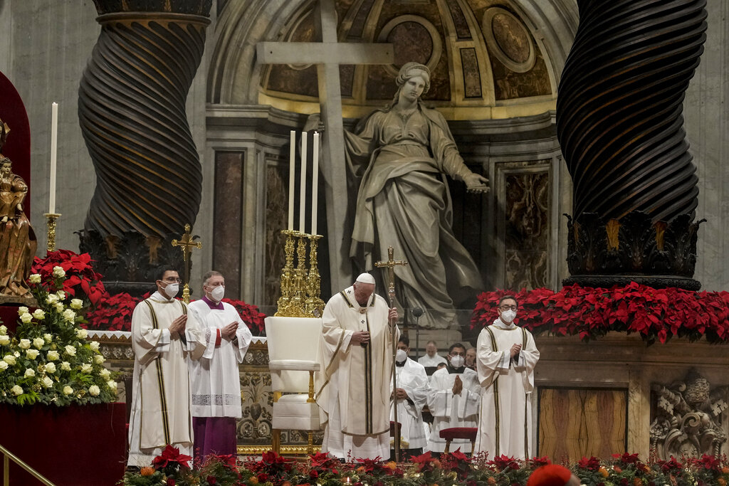 Pope Francis celebrated Christmas Eve Mass before an estimated 2,000 people in St Peter’s Basilica on Friday, going ahead with the service despite a resurgence in COVID-19 cases that has prompted a new vaccine mandate for Vatican employees.