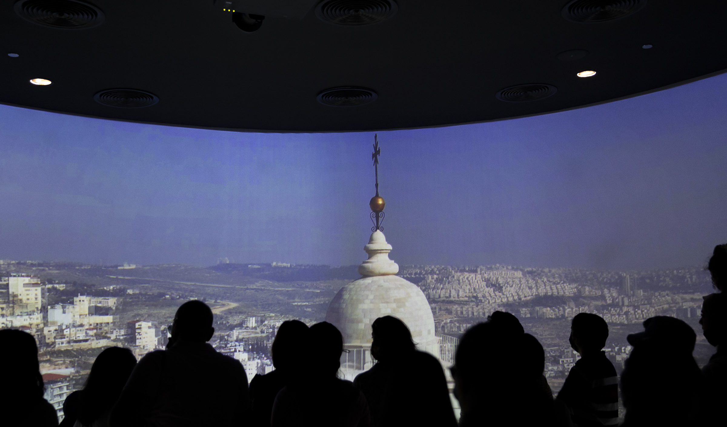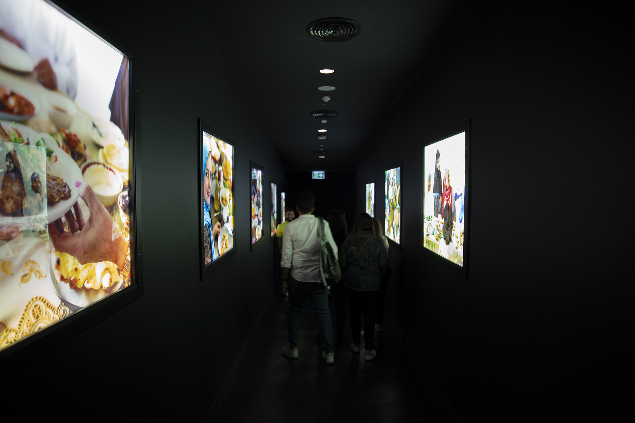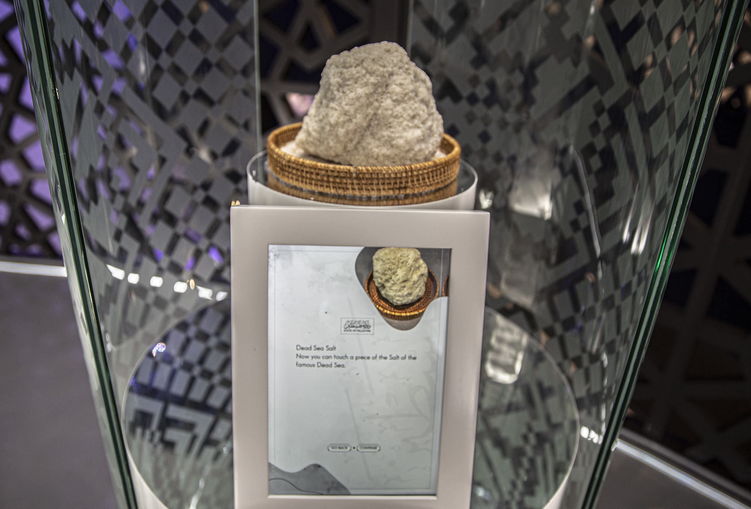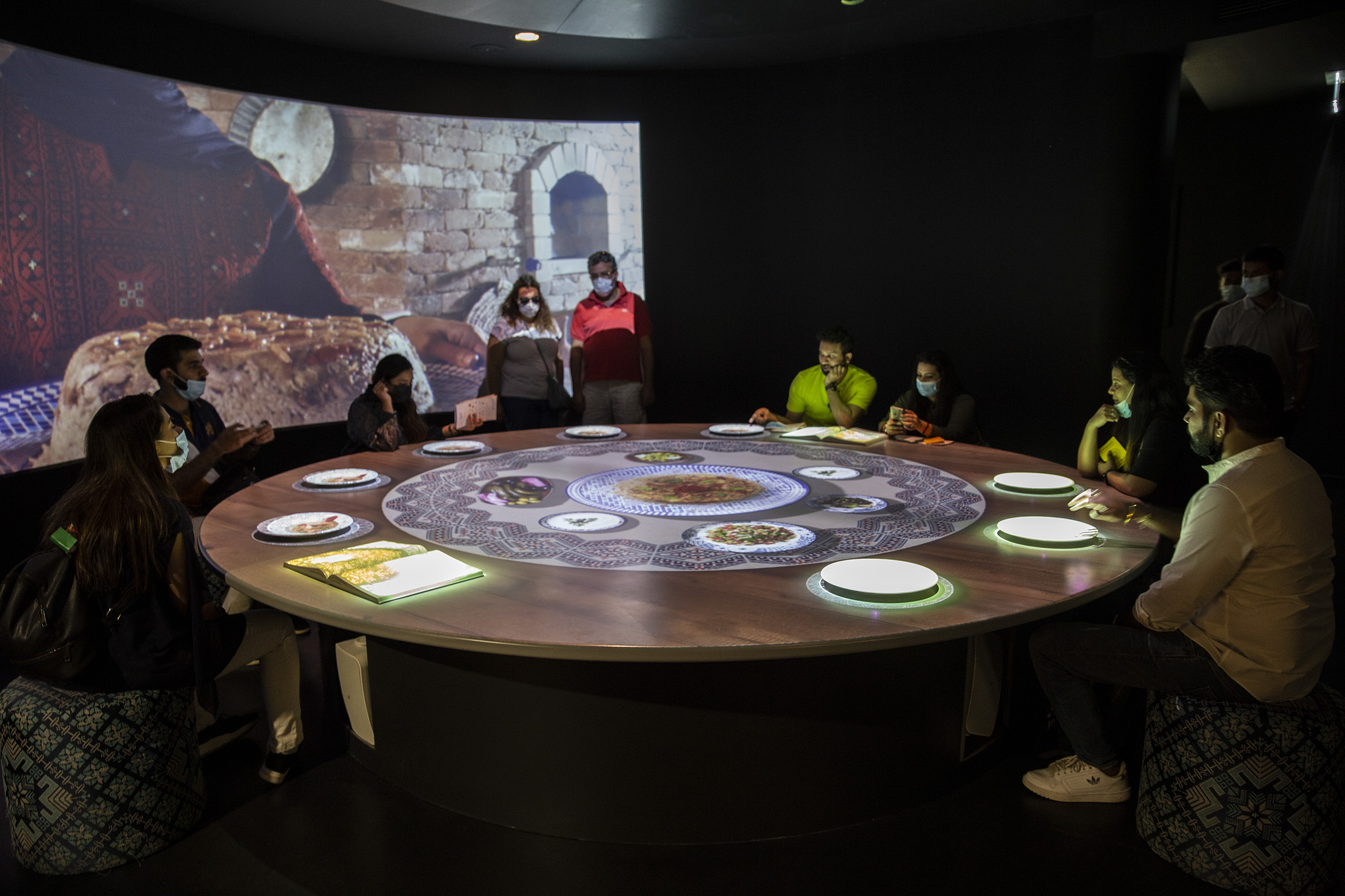 The pavilion itself portrays Palestine through the five senses, taking visitors on a journey of the land via seeing, hearing, touching, smelling and tasting what the state has to offer: Videos of the historic sites, a call to prayer from a mosque, a church bell, a piece of rock from the Dome of the Rock, the aroma of olives, a virtual reality (VR) tour of religious sites and a food table with virtual authentic cuisines and menus to browse.