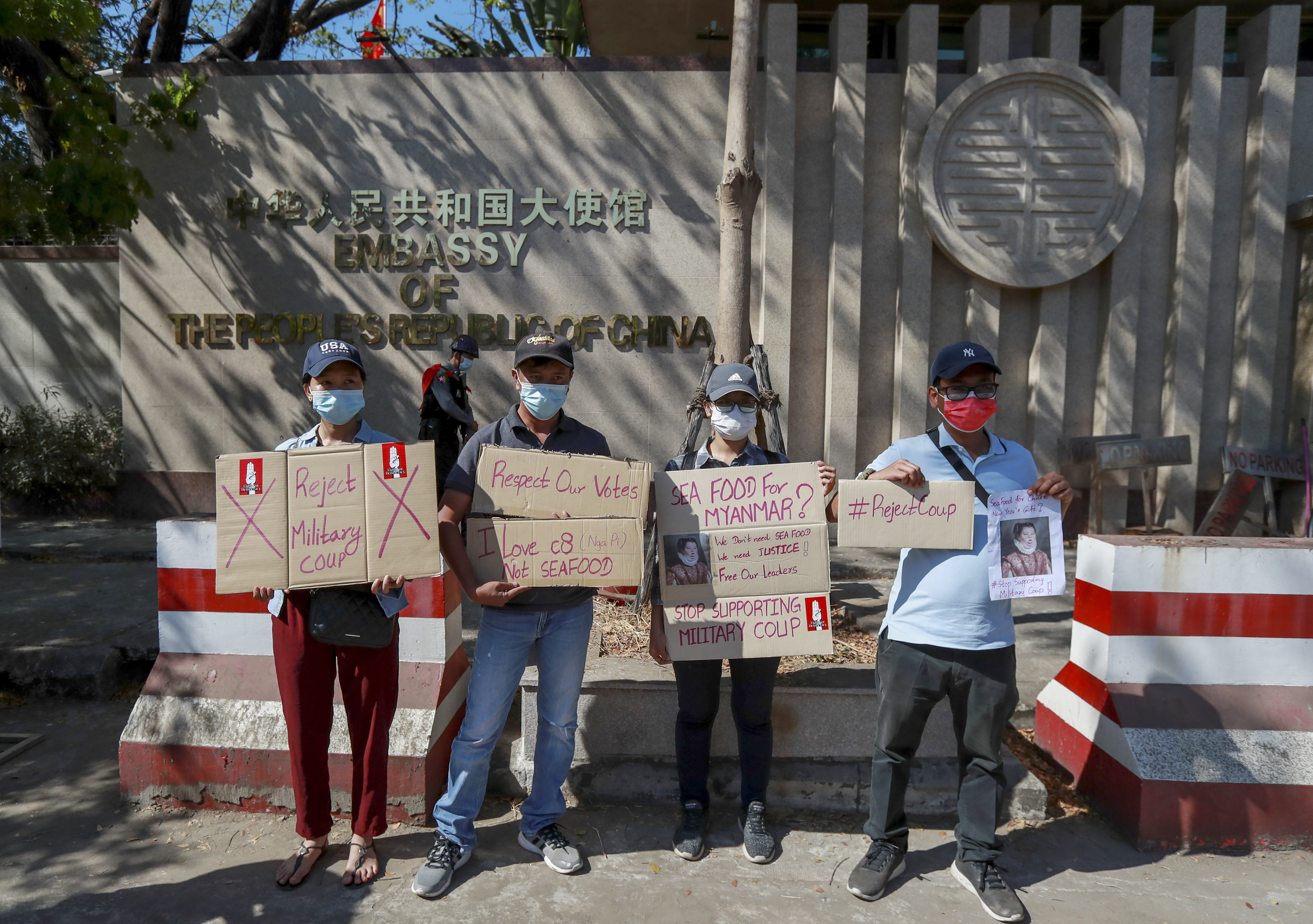 Chanting “Shame on you, China” and holding up banners in English, Chinese and Burmese, dozens of pro-democracy protesters gathered on Monday at the Chinese embassy in Yangon to denounce what they called Beijing’s backing for Myanmar’s military coup on February 1.