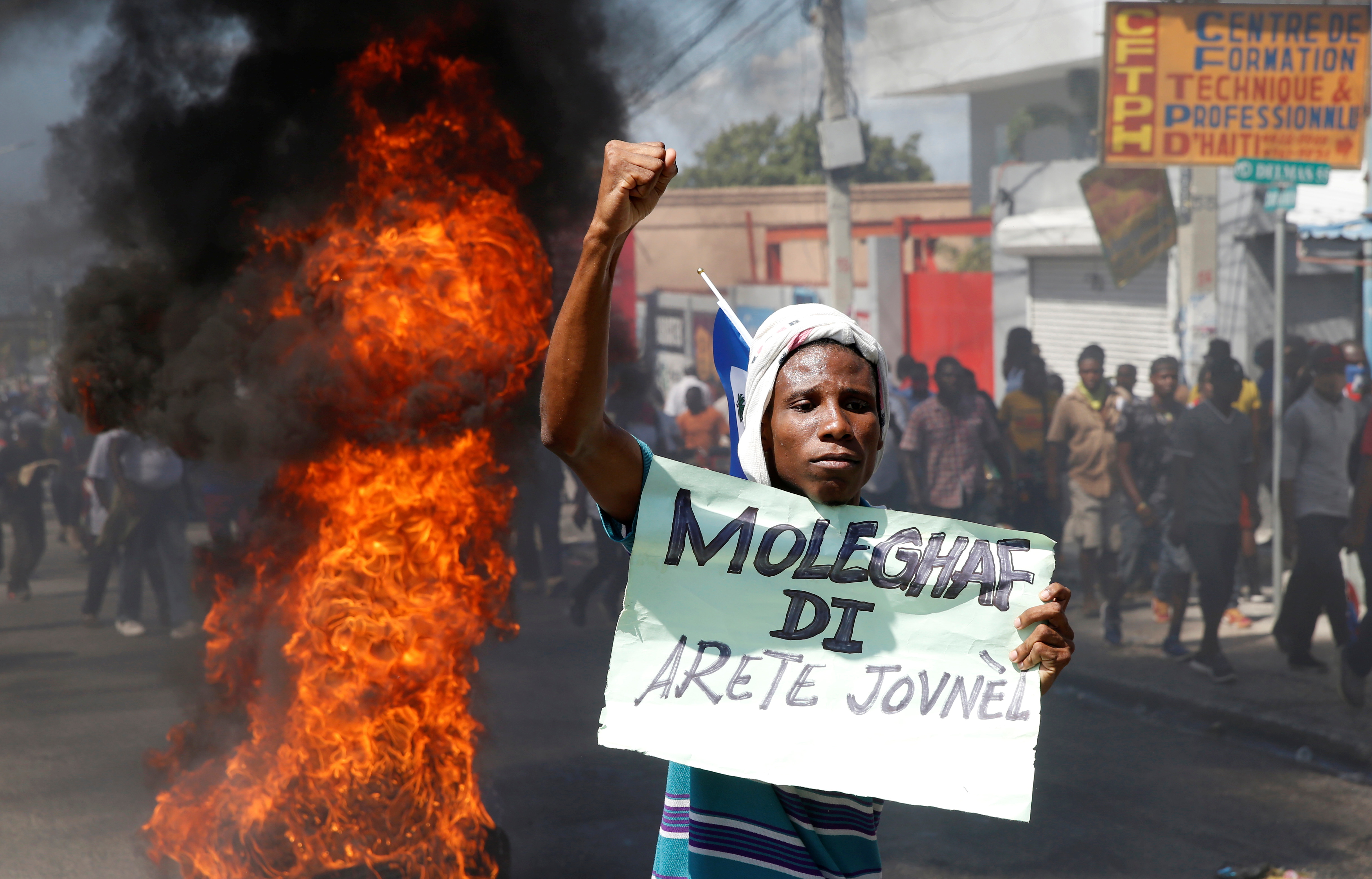 A demonstrator takes part in a protest against Haiti's President Jovenel Moise, in Port-au-Prince, on February 14 [Jeanty Junior Augustin/Reuters]