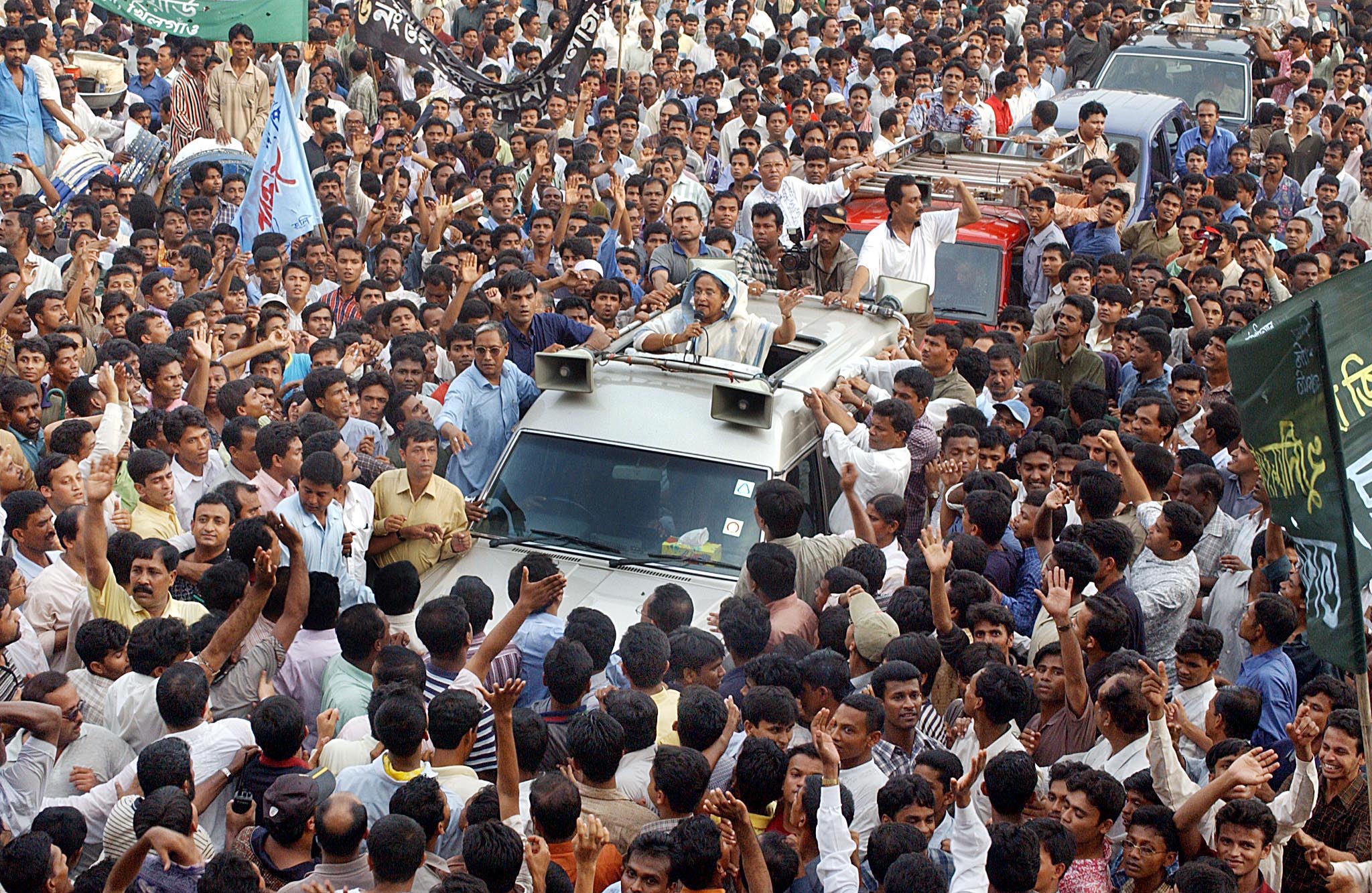 Hasina, atop the car, gestures as she shouts slogans leading thousands of her party during an anti-government demonstration in Dhaka on August 24, 2002 [File: Jewel Samad/AFP]