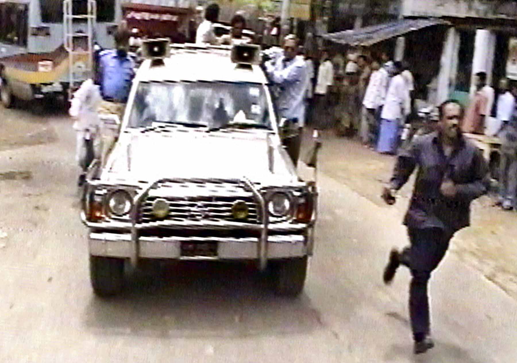 This video grab shows plainclothed security personnel, right, and a policeman, left on the car, with his weapon securing the car carrying Hasina after her convoy was attacked [AFP]