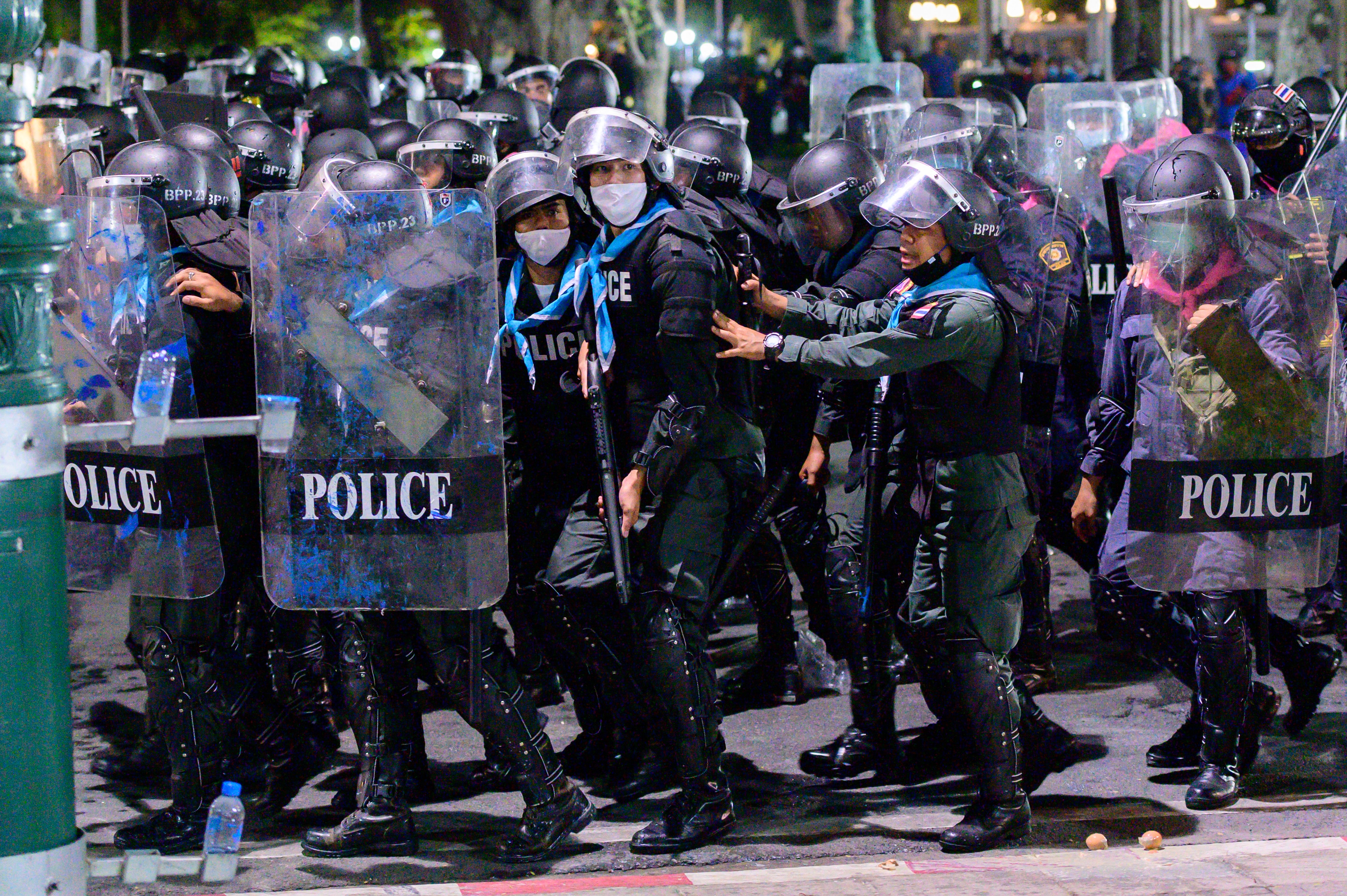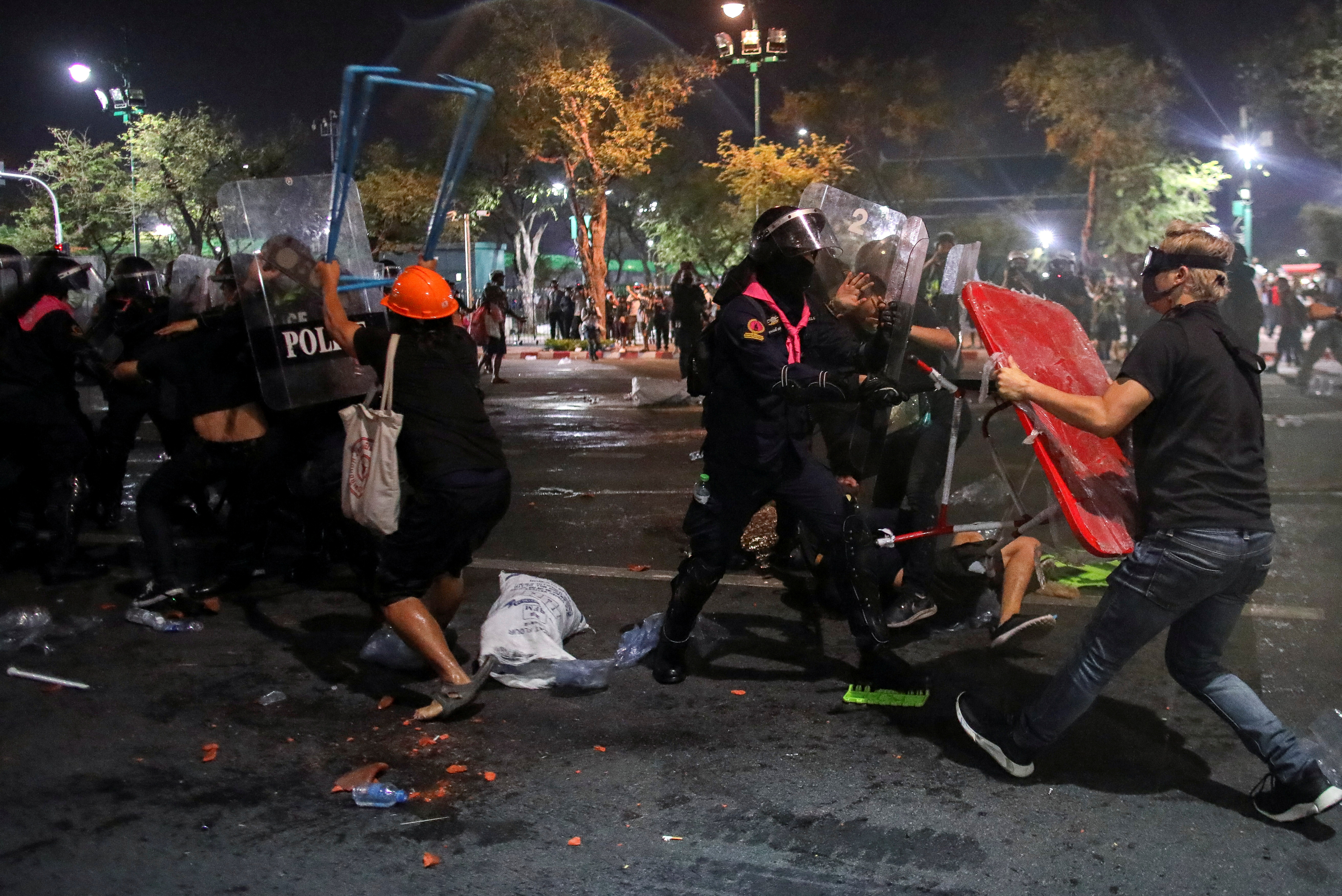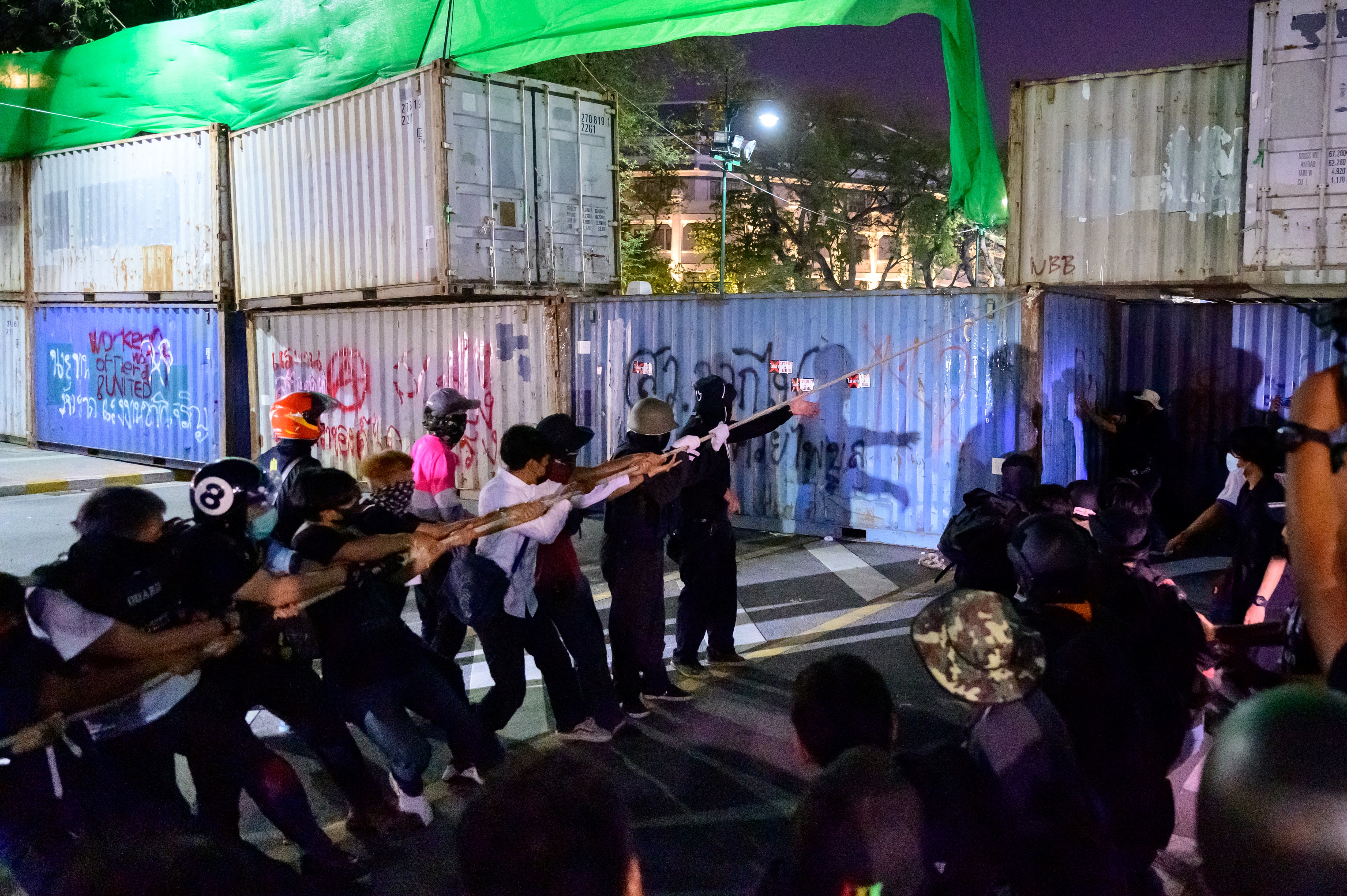 Security forces in riot gear pushed back about 1,500 protesters who had pulled down part of a barricade of shipping containers outside the Grand Palace. In some places, police faced off with protesters who threw firecrackers.