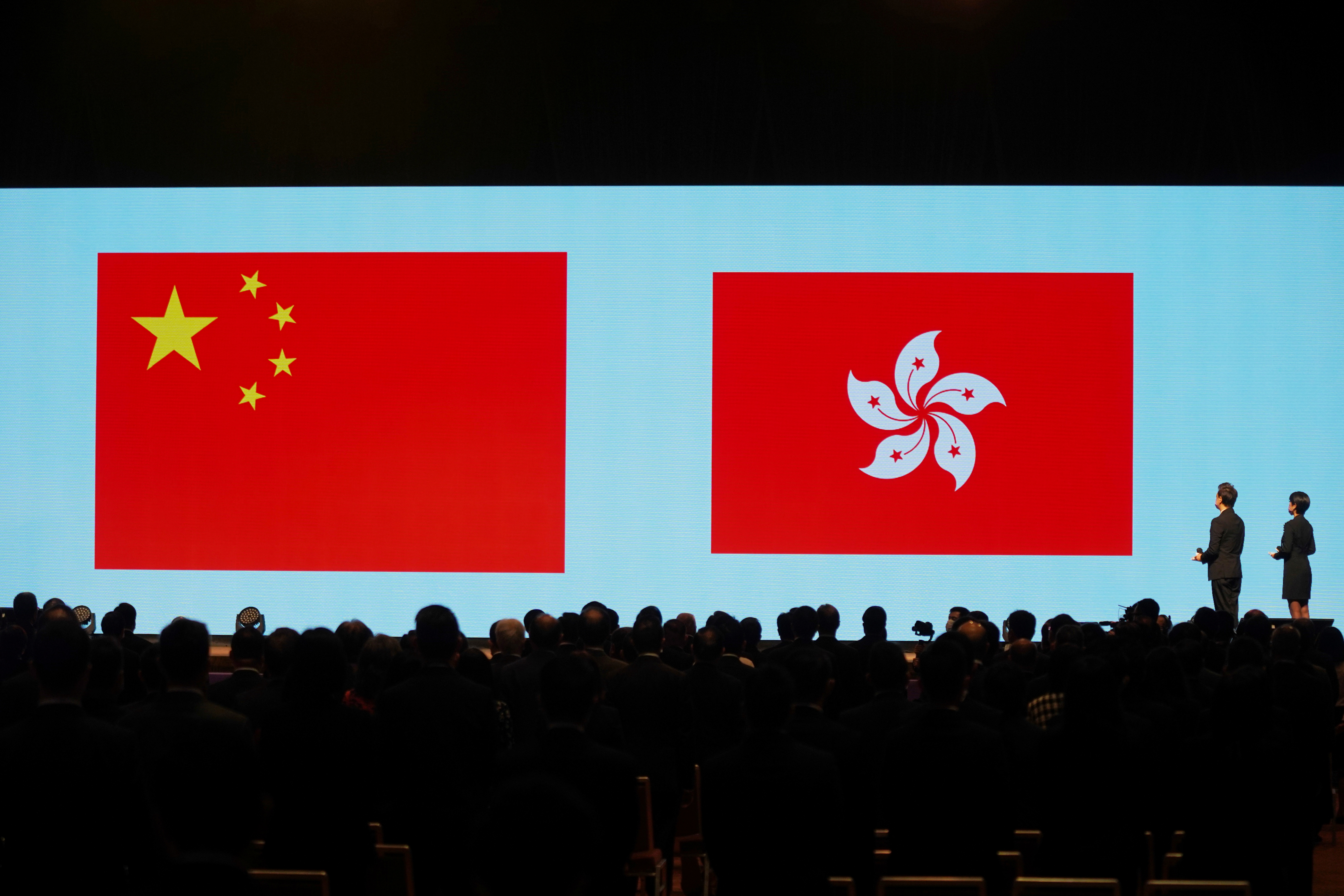 People stand in front of a screen showing Chinese and Hong Kong flags during a ceremony marking the National Security Education Day in Hong Kong, China, April 15, 2021 [Lam Yik/ Reuters]