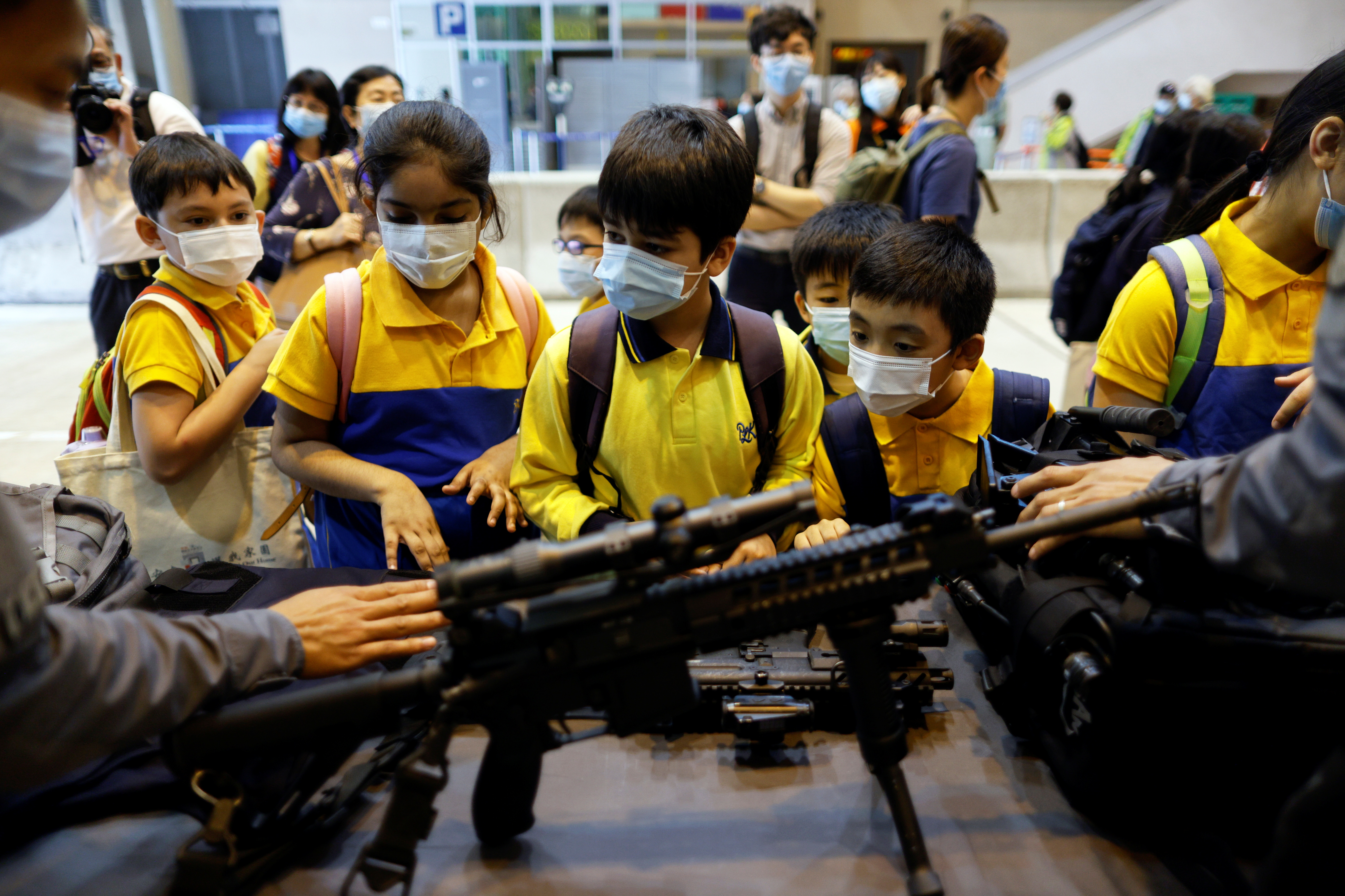 Children look at a submachine gun during an open day to mark the National Security Education Day, at Hong Kong Police College, in Hong Kong, China April 15, 2021 [Tyrone Siu/ Reuters]