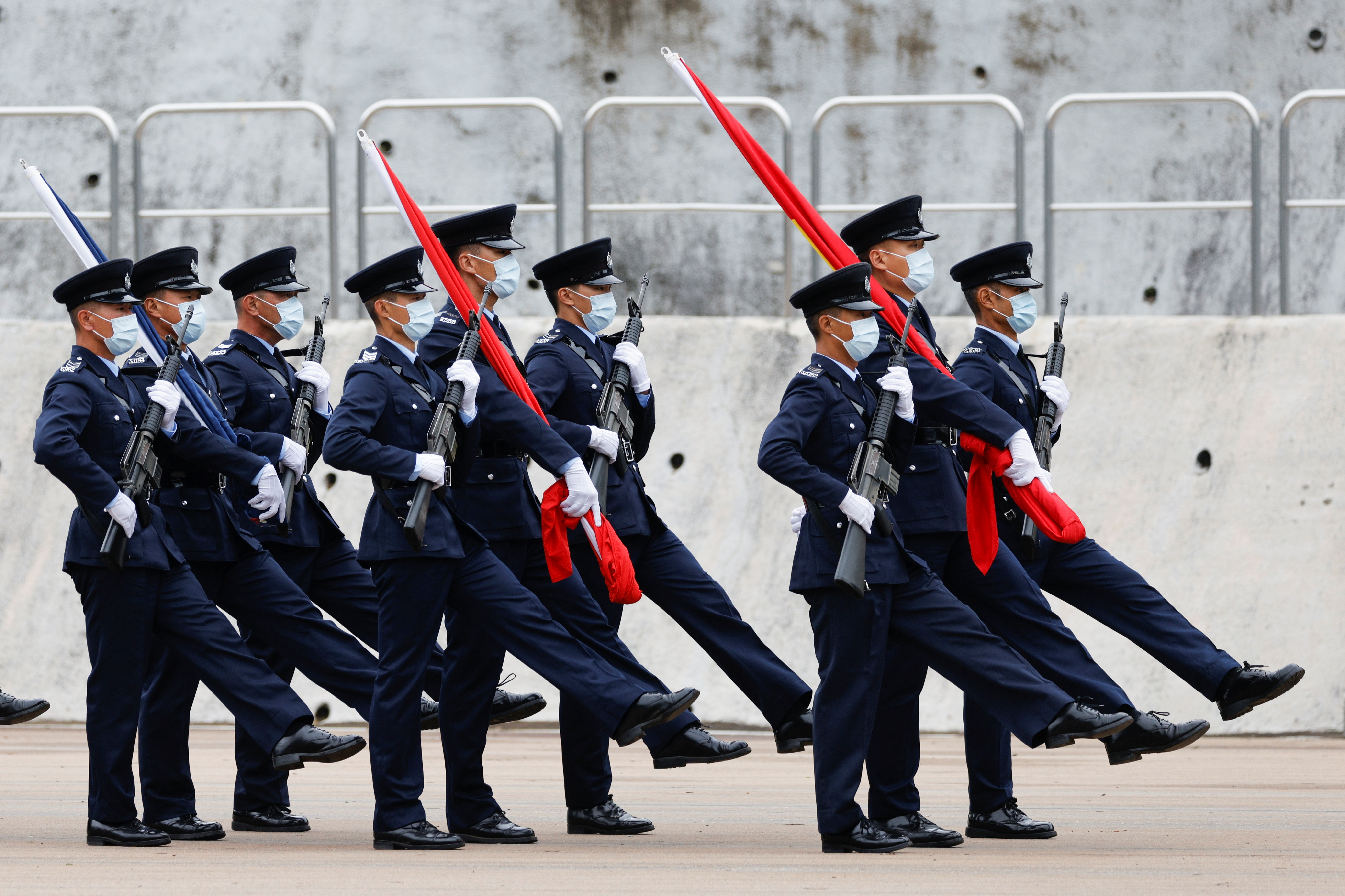 Hong Kong police meanwhile unveiled a new goose-step march in the mainland Chinese style, replacing British-style foot drills from the time the city was ruled by the United Kingdom until its 1997 handover to China.
