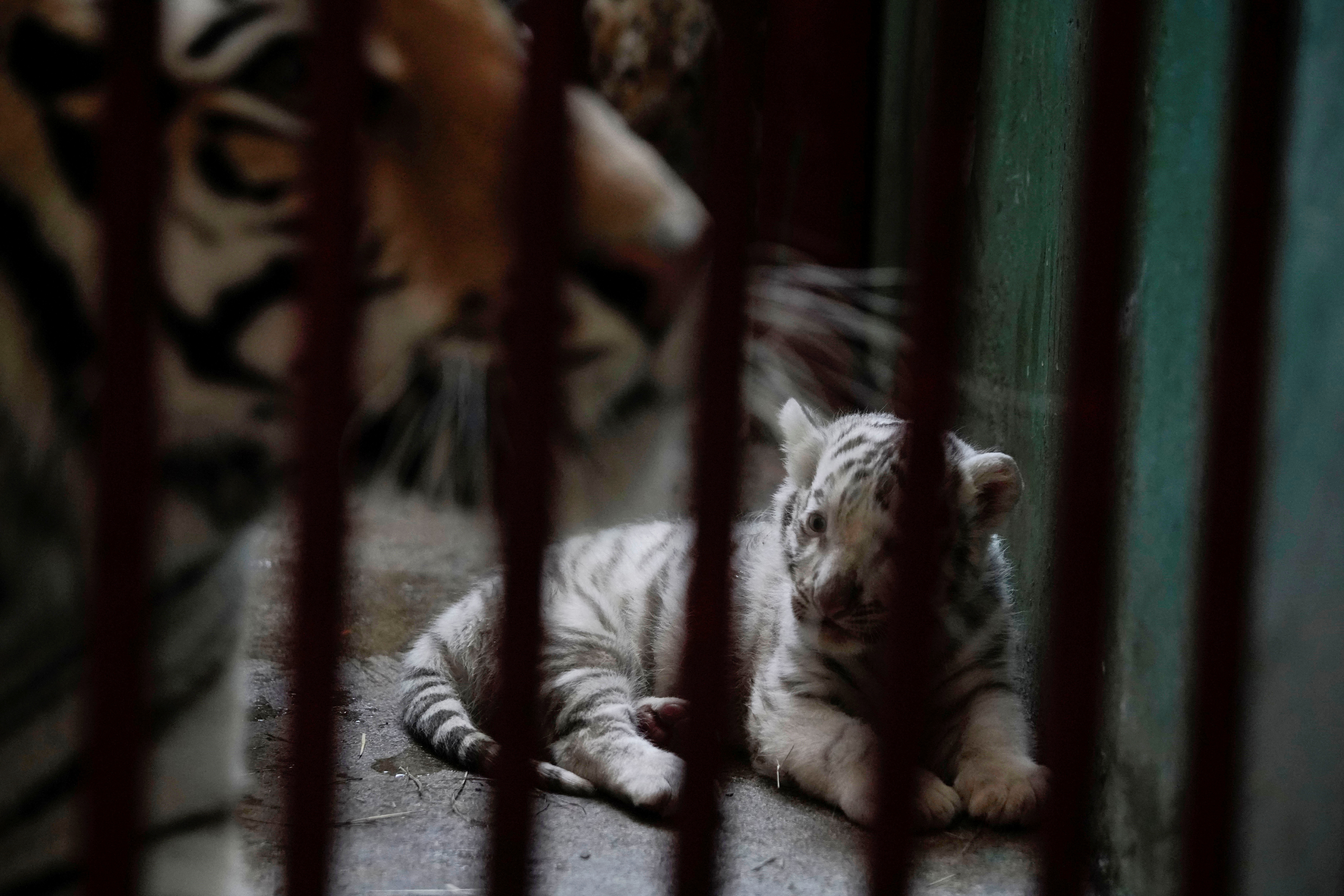 The tiger is one of four born on March 12 – white tigers are a genetic variation of orange Bengal tigers.