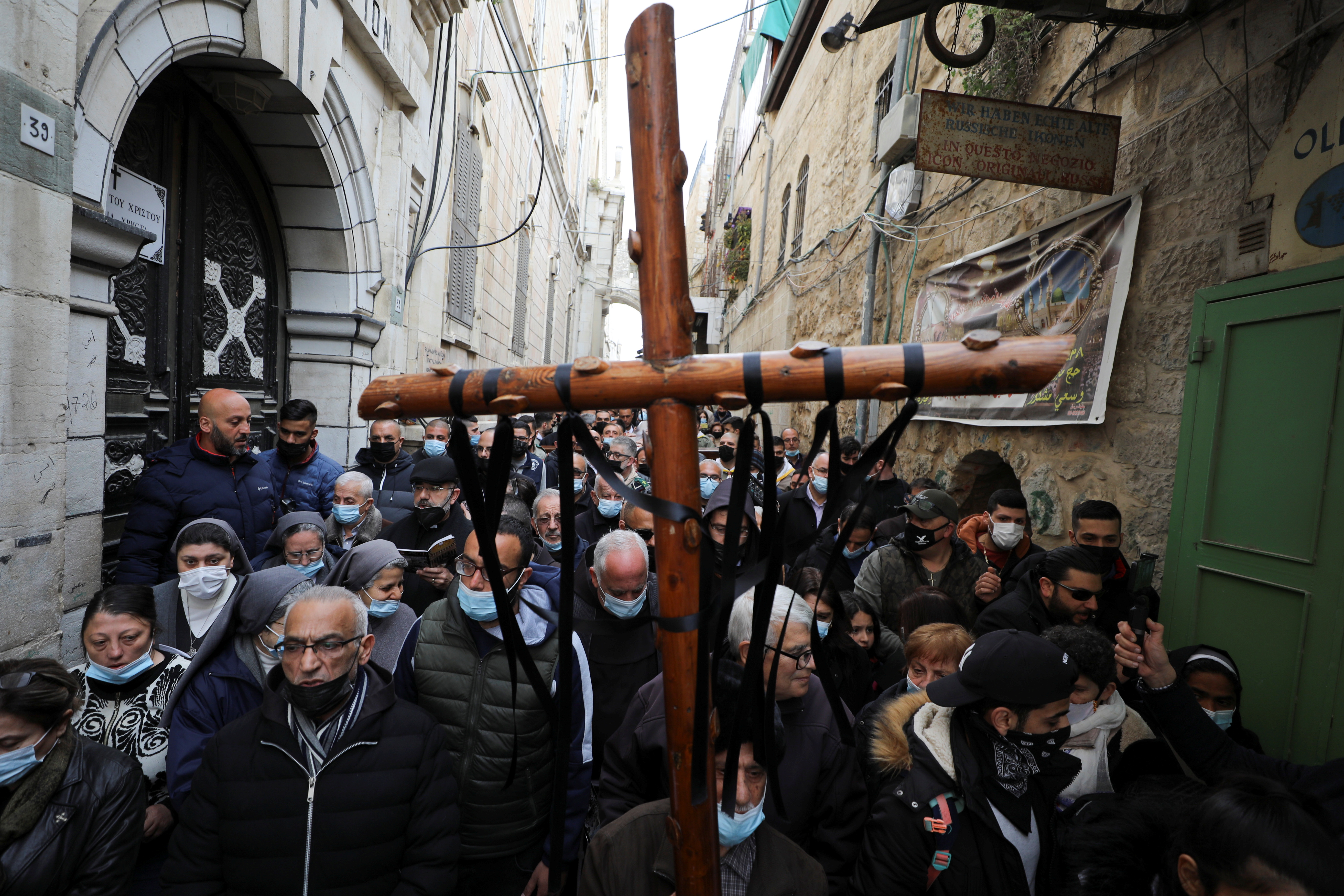 Another group carried a wooden cross along the route through the Old City, singing hymns and pausing to offer prayers.